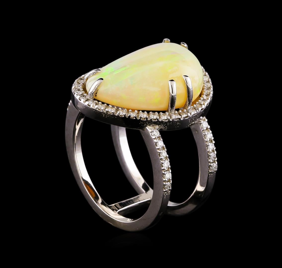 One electronically tested 14KT white gold ladies cast opal and diamond ring with a bright polish finish. The featured opal is set within a diamond bezel supported by diamond set double shoulders each measuring one millimeter wide. The shoulders are connected to create a nine millimeter wide open band. Condition is new, good workmanship. Containing: One semi crystal opal that is cut in a triangle shaped cabochon and is prong set, measuring 17.30 mm long x 11.30 mm wide, and 6.50 mm thick and the approximate weight is 7.92 carats. The opal has a somewhat bright, multicolor play of color (fire) in a broad flashfire pattern; a medium dome; a good cut; no inclusions; slight variation in base in its brightness and pattern; and is somewhat directional. Graded in the setting. Fifty-Seven prong set round brilliant cut diamonds, measuring 1.30 - 1.20 x 0.75mm (depth est.) approximate total weight of 57 Stones = 0.50ct. Graded in the setting. Clarity: SI-1 to I-1. Color: F - H. Total Weight of Diamonds 0.50ct. Total Weight of Opals 7.92ct. Total Weight of Ring 7.76gm. AIG Appraised at $5,205.00.