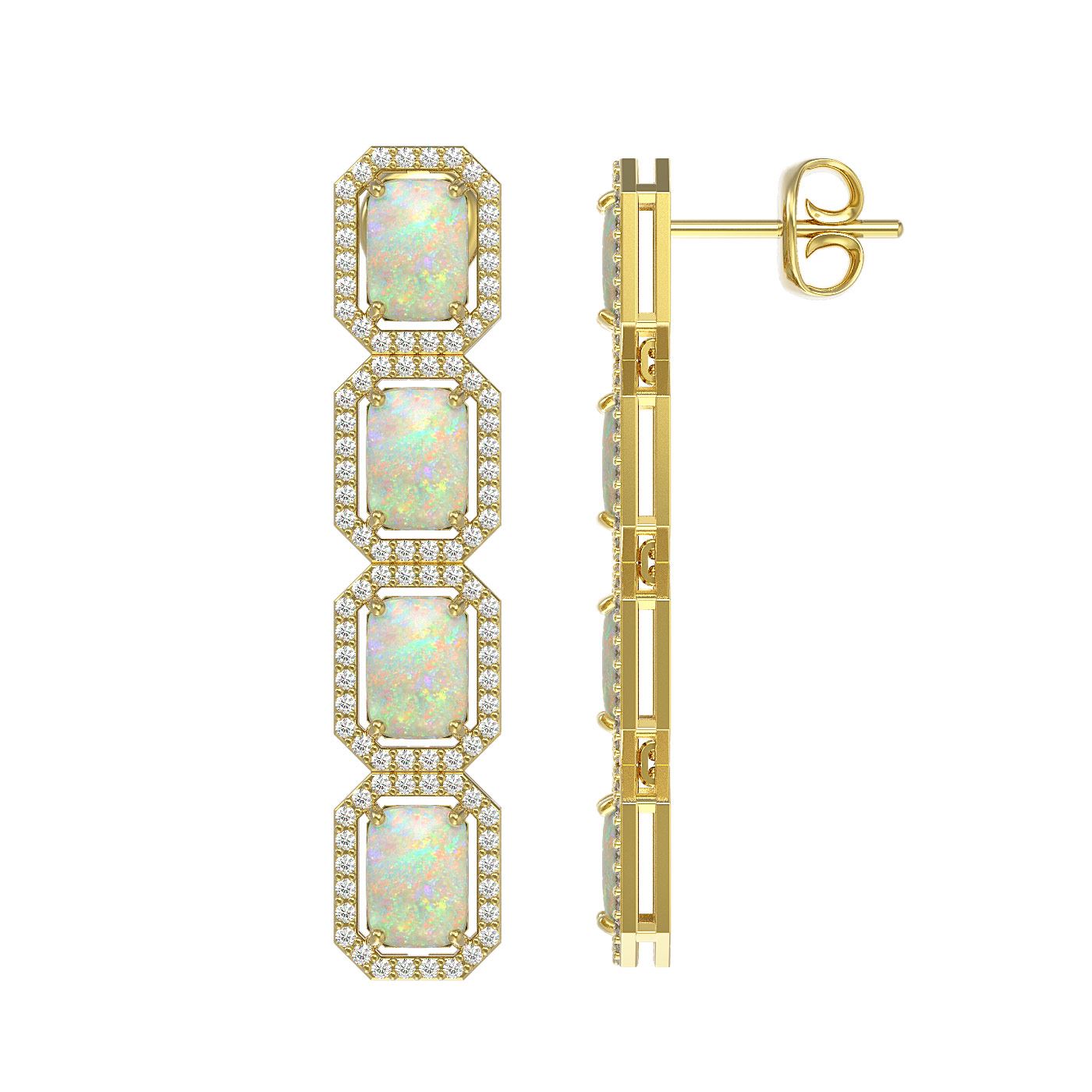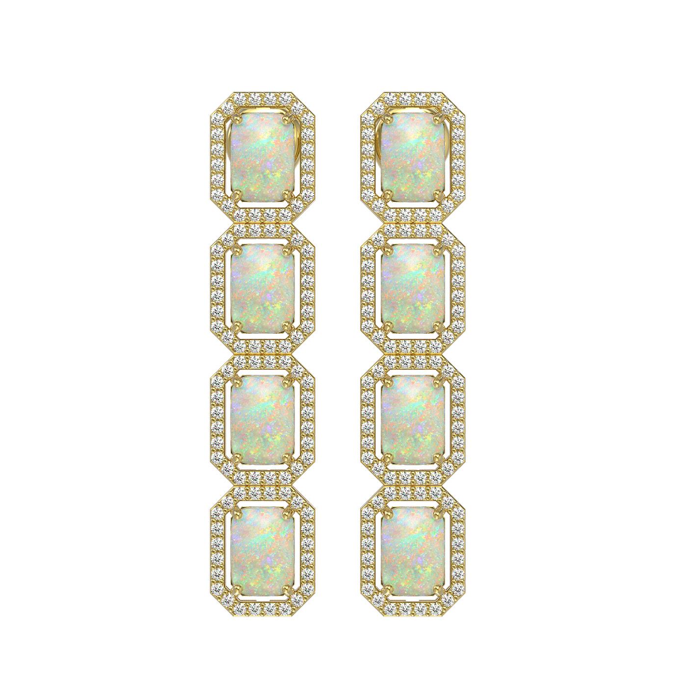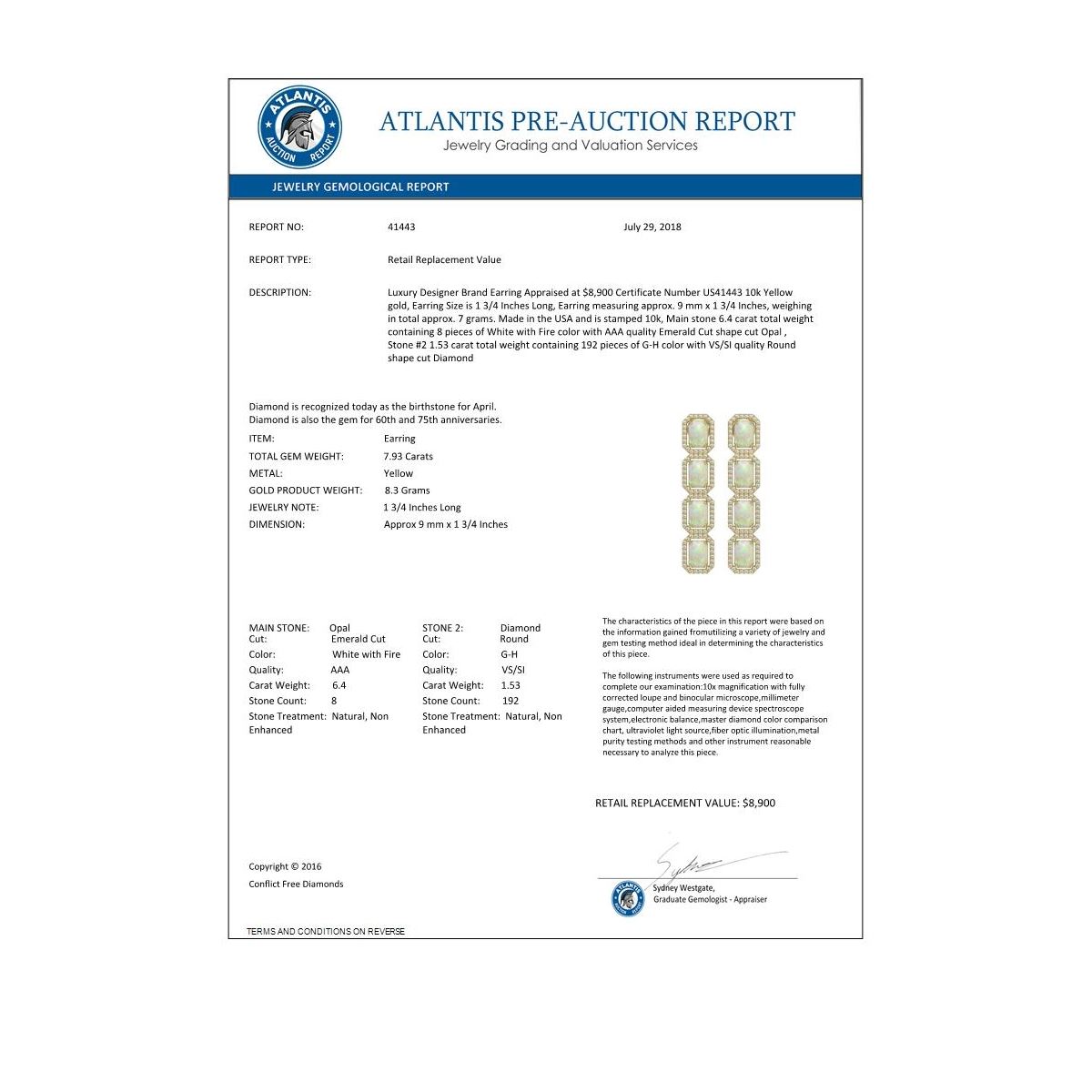 REF-162X2T -41443 ---- 7.93 CTW Opal & Diamond Halo Earrings 10K Yellow Gold ---- Luxury Designer Brand Earring Appraised at $8,900 Certificate Number US41443 10k Yellow gold, Earring Size is 1 3/4 Inches Long, Earring measuring approx. 9 mm x 1 3/4 Inches, weighing in total approx. 7 grams. Made in the USA and is stamped 10k, Main stone 6.4 carat total weight containing 8 pieces of White with Fire color with AAA quality Emerald Cut shape cut Opal , Stone #2 1.53 carat total weight containing 192 pieces of G-H color with VS/SI quality Round shape cut Diamond