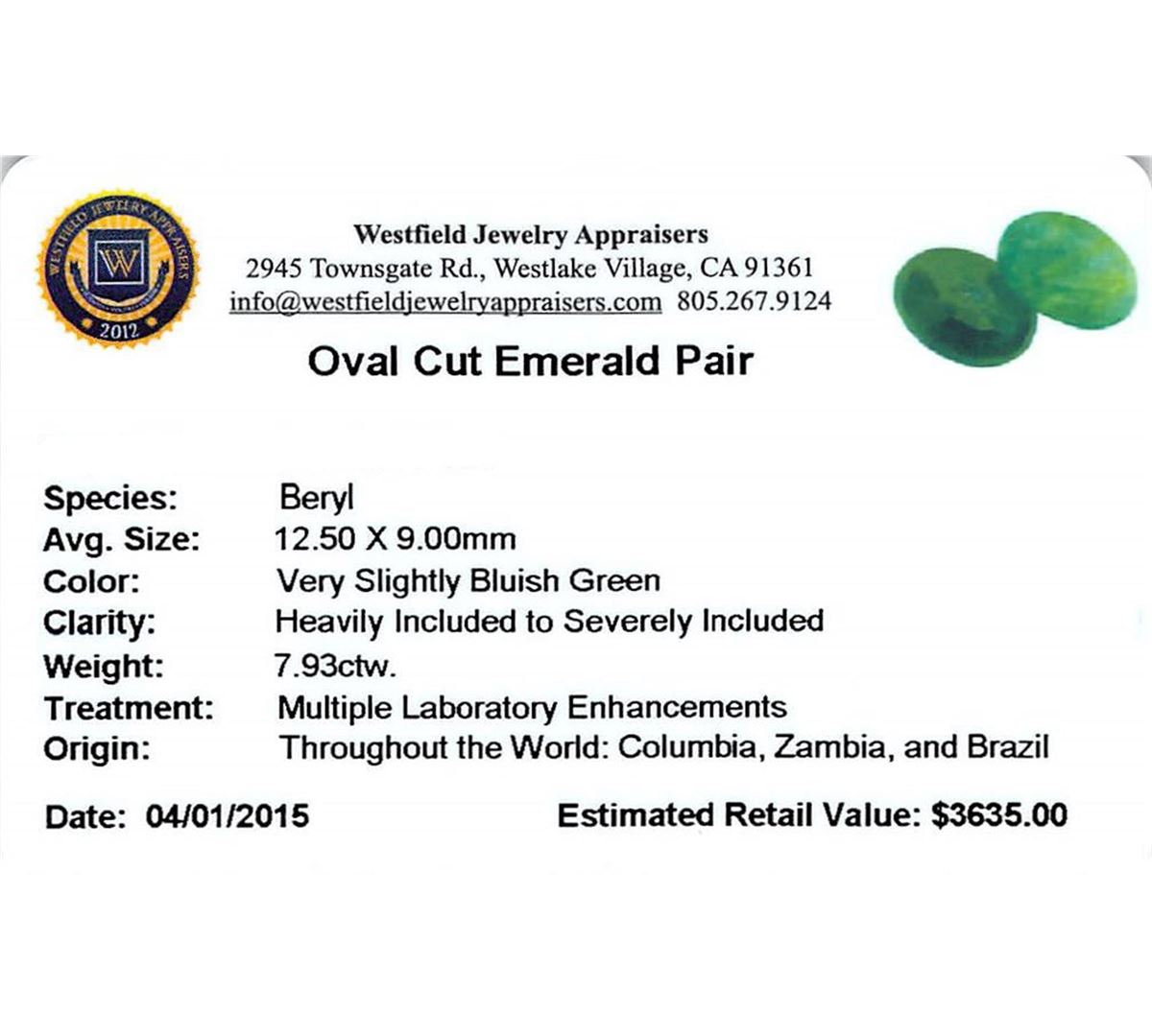 Two oval mixed cut natural emeralds exact total weight 7.93ct., clarity is heavily included, type III, medium dark, very slightly grayish, very slightly bluish green color, (GIA vslbG 6/3), cut is good. Westfield Appraised at $3,635.00.