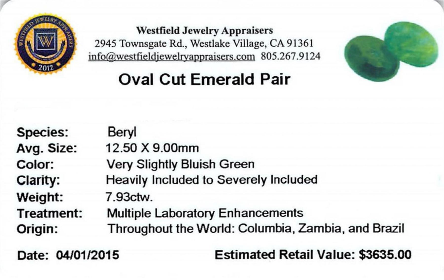 Two oval mixed cut natural emeralds exact total weight 7.93ct., clarity is heavily included, type III, medium dark, very slightly grayish, very slightly bluish green color, (GIA vslbG 6/3), cut is good. Westfield Appraised.