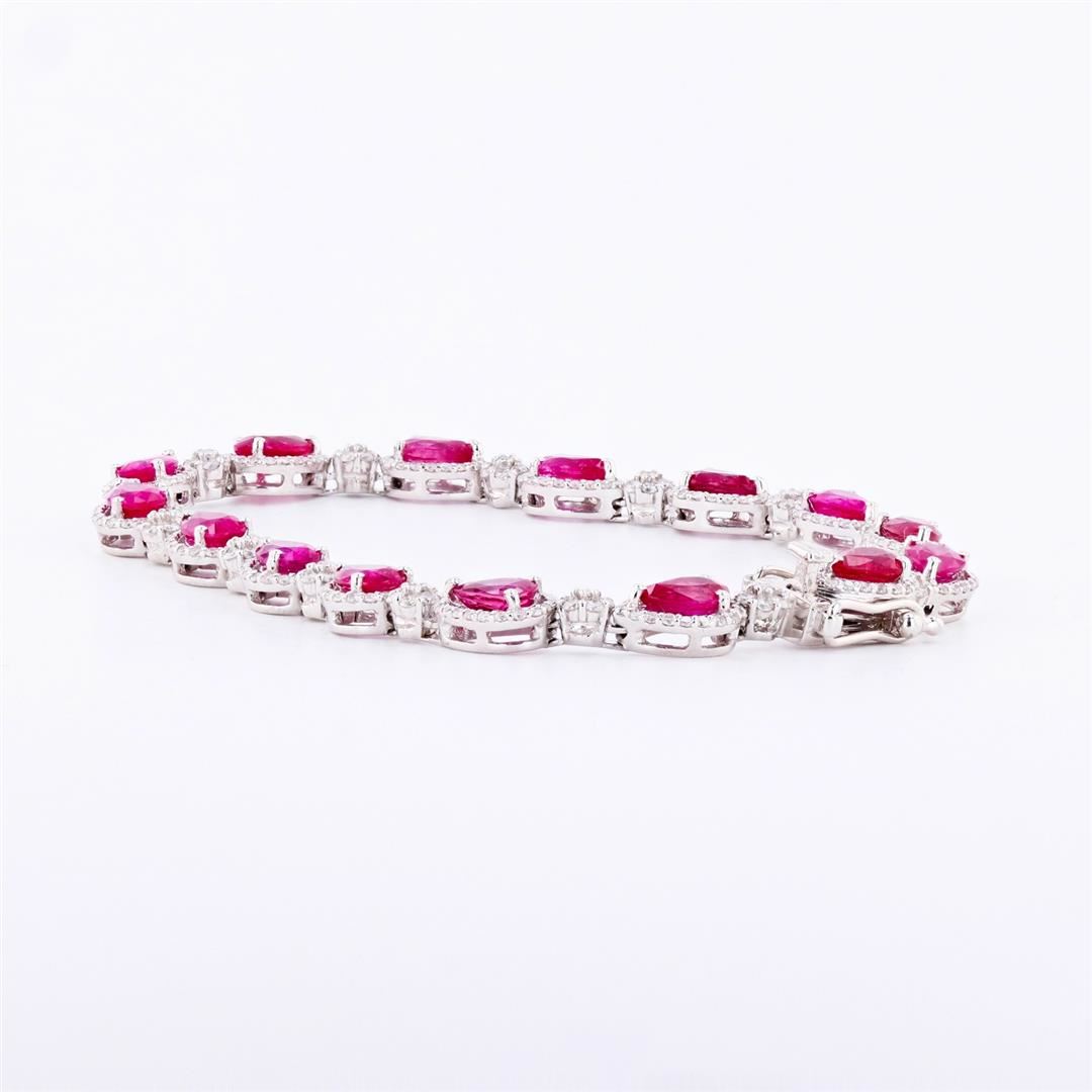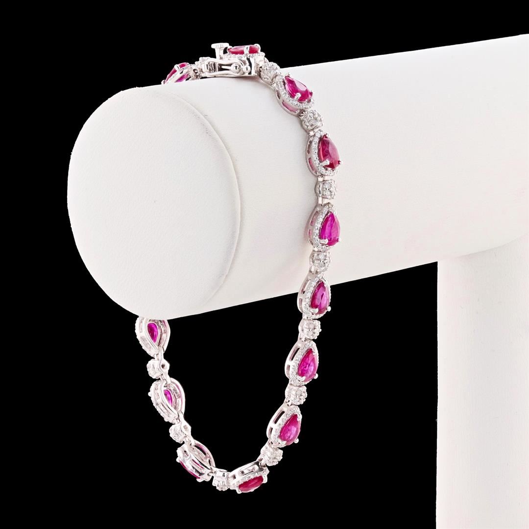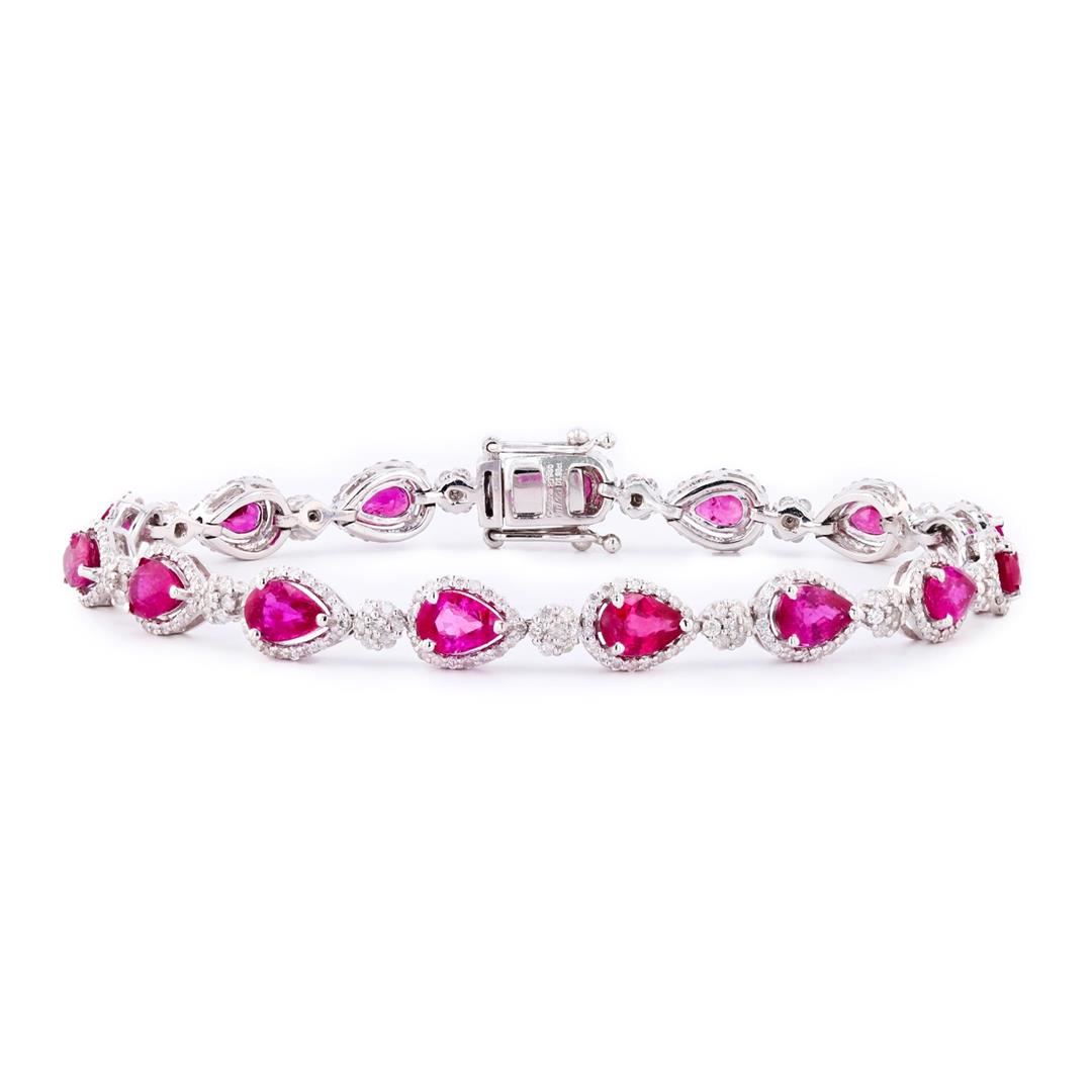 7.93ctw Ruby and 1.93ctw Diamond Platinum Bracelet. One electronically tested platinum ladies cast & assembled ruby & diamond bracelet. Condition is new, good workmanship. The flexible seven and one quarter inch length bracelet features a series of ruby & diamond bezels alternating with smaller diamond clusters, completed by a concealed clasp, with twin safeties. Bright polish finish. Trademark is Orianne. Identified with markings of'PT950" Containing: Three hundred ninety prong set round brilliant cut diamonds approximate total weight of 390 Stones = 1.93ctw. The clarity & color grade reflect the overall average for the group. Graded in the setting. Clarity I1 to I2 Color F - H Fifteen prong set pear mixed cut natural rubies, measuring 6.00 x 4.00 x 2.60mm, approximate total weight of 7.93ctw., clarity is heavily included, type II, medium dark, moderately strong, slightly purplish red color, (GIA slpR 6/4), cut is good. Transmitting light somewhat diffusely, transparent to translucent. Naturally occurring internal & external characteristics are present. Indications of laboratory high temperature heat treatment. Measurements and the color grade are an average for the group. Graded in the setting. Ruby has a low tolerance to rhodium plating, repolishing the surface, & ultrasonic cleaning. Total Weight of Colored Stones 7.93ctw. Total Weight of Diamonds 1.93ctw. Total Weight of Bracelet 19.90gm
