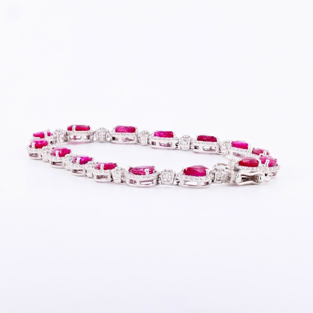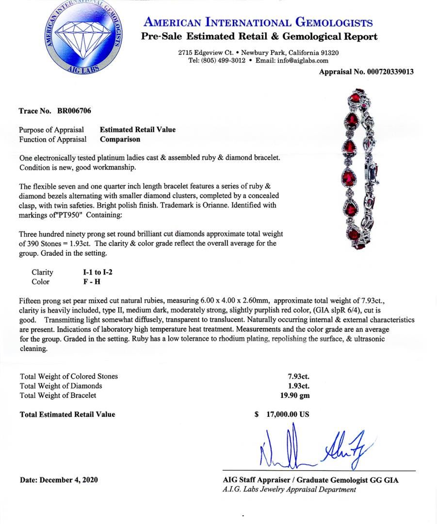 One electronically tested platinum ladies cast & assembled ruby & diamond bracelet. Condition is new, good workmanship. The flexible seven and one quarter inch length bracelet features a series of ruby & diamond bezels alternating with smaller diamond clusters, completed by a concealed clasp, with twin safeties. Bright polish finish. Trademark is Orianne. Identified with markings of'PT950" Containing: Three hundred ninety prong set round brilliant cut diamonds approximate total weight of 390 Stones = 1.93ctw. The clarity & color grade reflect the overall average for the group. Graded in the setting. Clarity I1 to I2 Color F - H Fifteen prong set pear mixed cut natural rubies, measuring 6.00 x 4.00 x 2.60mm, approximate total weight of 7.93ctw., clarity is heavily included, type II, medium dark, moderately strong, slightly purplish red color, (GIA slpR 6/4), cut is good. Transmitting light somewhat diffusely, transparent to translucent. Naturally occurring internal & external characteristics are present. Indications of laboratory high temperature heat treatment. Measurements and the color grade are an average for the group. Graded in the setting. Ruby has a low tolerance to rhodium plating, repolishing the surface, & ultrasonic cleaning. Total Weight of Colored Stones 7.93ctw. Total Weight of Diamonds 1.93ctw. Total Weight of Bracelet 19.90gm