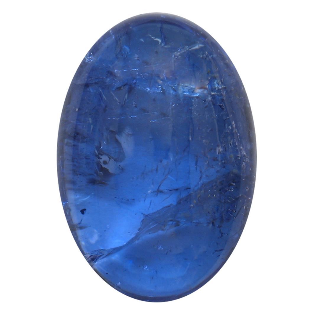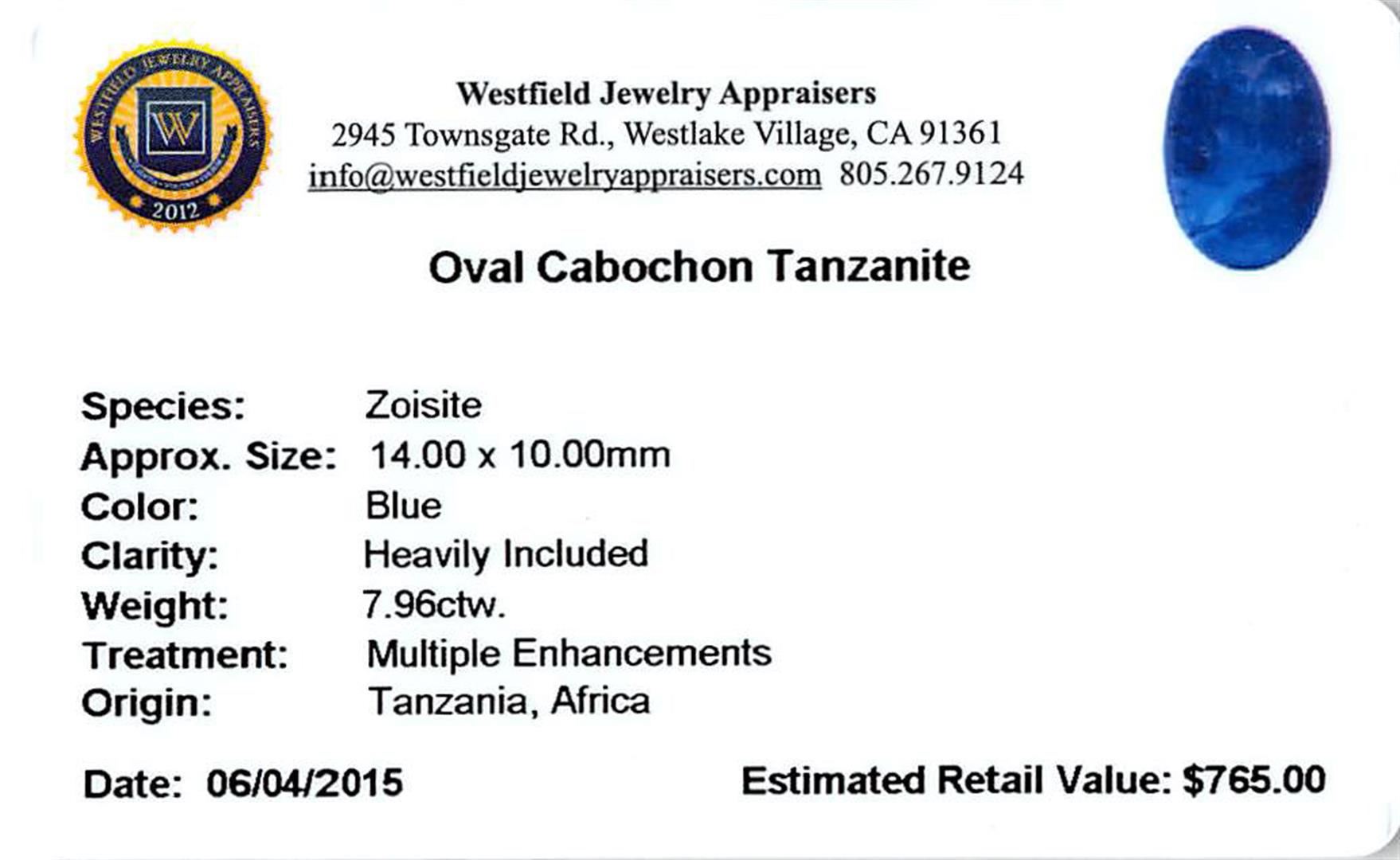 One oval cabochon cut natural tanzanite, measuring 15.00 x 10.00 x 6.00mm, exact weight 7.96ct., clarity is heavily included, type I, dark, moderately strong, blue color, (GIA B 7/4), cut is good. Transmitting light somewhat diffusely, transparent to translucent. Naturally occurring internal & external characteristics are present. Indications of heat treatment. Westfield Appraised at $765.00.