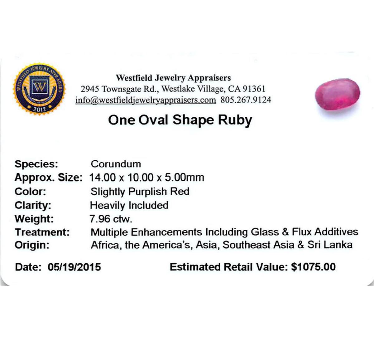 One oval mixed cut natural ruby, measuring 14.00 x 10.00 x 5.00mm, exact weight 7.96ct., clarity is heavily included, type II, medium dark, very slightly brownish, slightly purplish red color, (GIA slpR 6/3), cut is good. Westfield Appraised at $1,075.00.