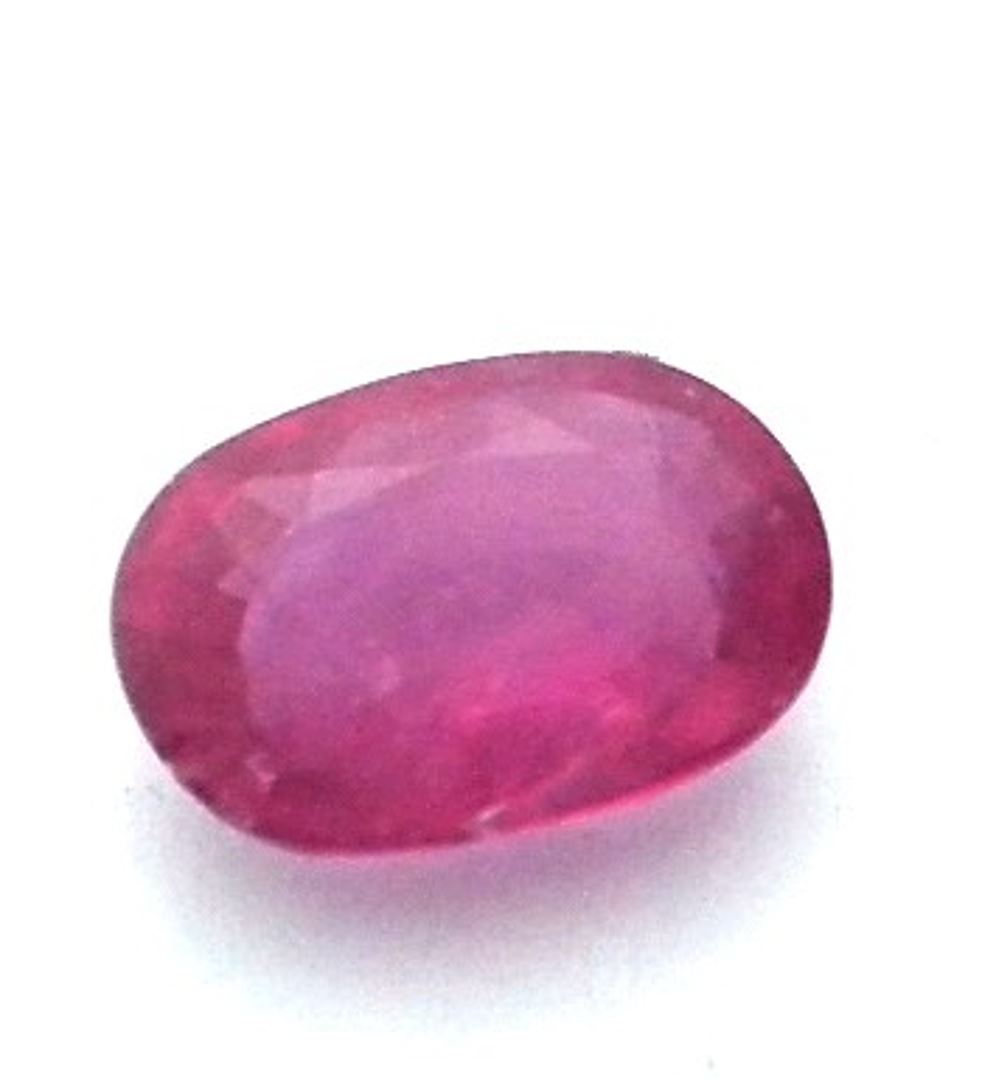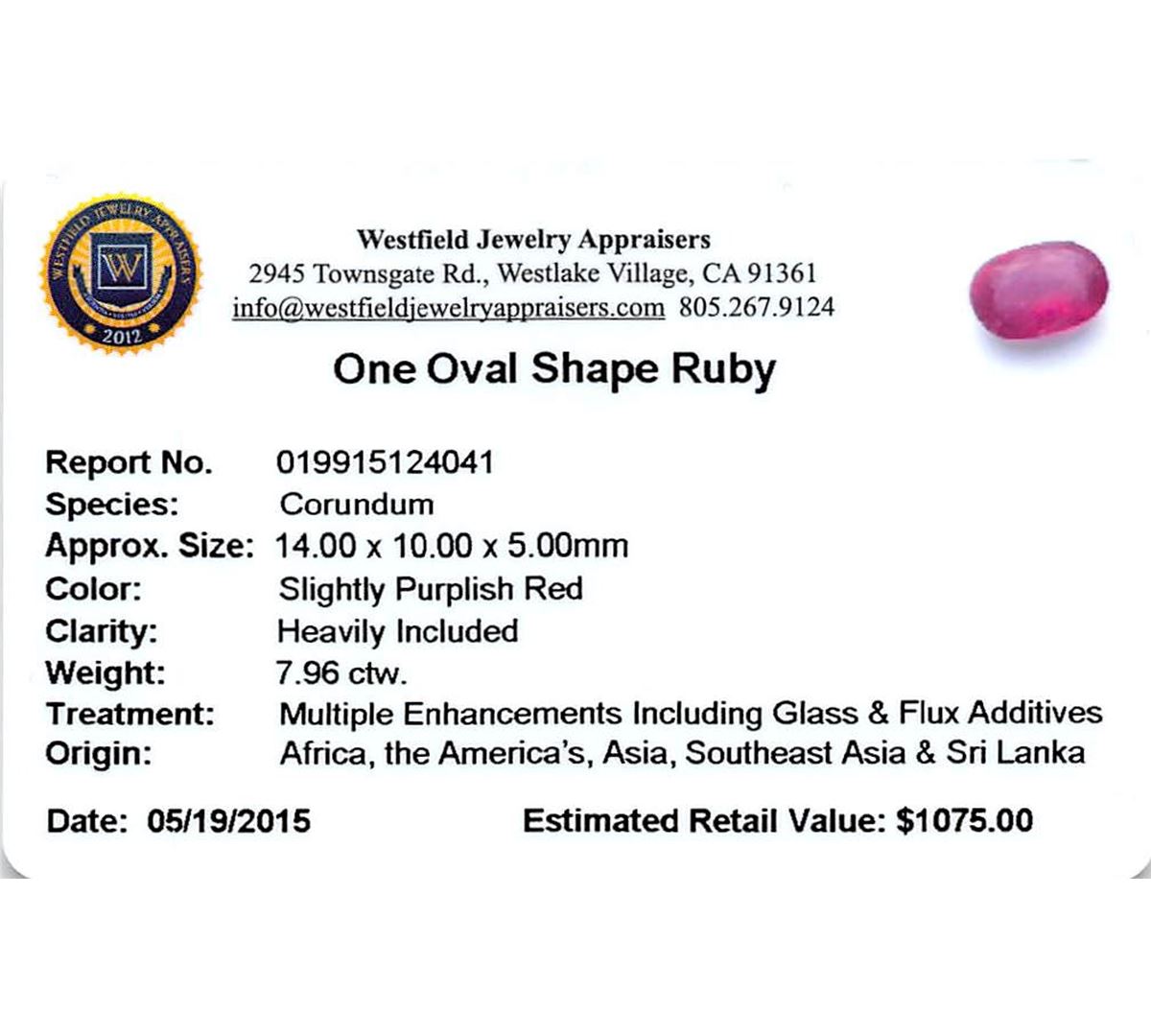 One oval mixed cut natural ruby, measuring 14.00 x 10.00 x 5.00mm, exact weight 7.96ct., clarity is heavily included, type II, medium dark, very slightly brownish, slightly purplish red color, (GIA slpR 6/3), cut is good. Westfield Appraised at $1,075.00.