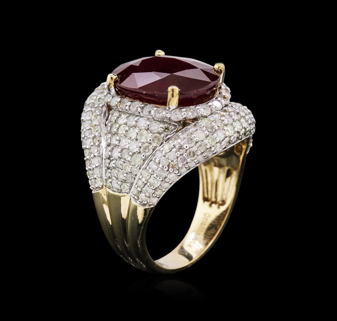 Fourteen karat (14K) yellow gold ruby and diamond ring. An oval cut ruby corundum gemstone is prong mounted in the center of the ring. Round brilliant cut diamonds accent the ring around the center gemstone. The ring is cast stamped "14K" and has a gross weight of 5.4 Grams. Diamond(s): Shape: Round Brilliant Cut. Weight: 2.42 carat. Average Clarity: I1-I2. Average Color: H-J. Symmetry: Very Good. Polish: Very Good. GemStone(s): Ruby Corundum. Nature: Natural. Shape: Oval, Faceted. Quantity: 1. Weight: 7.97 carat total. Dimensions: Length- 13.80 mm. ; Width 11.13 mm. Bulge: Visible. Clarity: I1, Type 3. Color: Red (5/5). Symmetry: Very Good. Color Intensity: Medium. Transparency: Transparent. Tone: Dark. Enhancements: Indications of high temperature heat treatment, with glass and flux additives. Metal(s): Metal: Gold, Stamped. Purity: 14K. Color: Yellow. Condition: Excellent. Finish: High polish. GGA Appraised at $8,590.00.