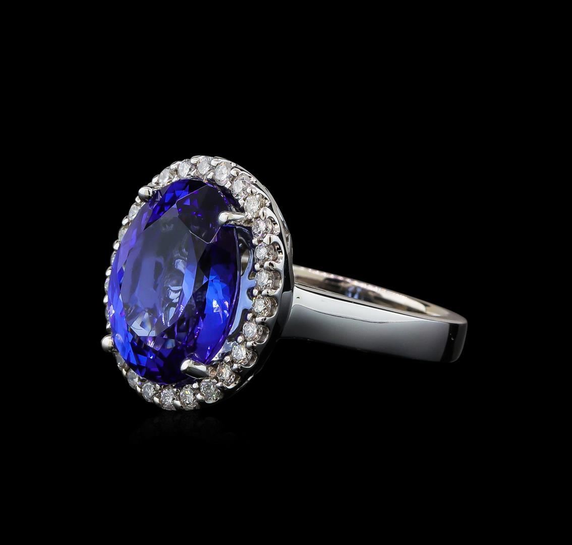 One electronically tested 14KT white gold lady's cast fashion ring with a basket halo with a bright polish finish. The featured lady's ring has a shank measuring 2.91 millimeters wide. Identified with markings of '14K'. Condition is new, good workmanship. Containing: One prong set oval modified brilliant cut natural tanzanite, measuring 14.37 x 11.56 x 7.02mm, (depth est.) approximate weight of 7.98ct., clarity is eye clean, medium dark, moderately strong, violetish blue color, (GIA vB 6/4), cut is very good. Transmitting light with no distortion, transparent. Colored gemstones are presumed to have been subjected to commonly used enhancement processes. Graded loose prior to setting in the GIA Laboratory, Report #5172668395. Twenty-Six prong set round brilliant cut diamonds, measuring 1.70 - 1.60 x 1.02mm (depth est.) approximate total weight of 26 Stones = 0.45ct. Graded in the setting. Clarity SI-1 to I-1. Color: H - I Cut Good. Total Weight of Colored Stones 7.98ct.. Total Weight of Diamonds 0.45ct.. Total Weight of Ring 8.40gm GAS Appraised.