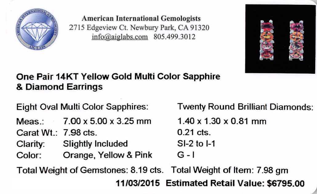 One Pair 14KT Yellow Gold Multi Color Sapphire and Diamond Earrings: Eight Oval Multi Color Sapphires: Measures: 7.00 x 5.00 x 3.25 mm. Carat Weight: 7.98cts. Clarity: Slightly Included. Color: Orange, Yellow, and Pink. Twenty Round Brilliant Diamonds: Measures: 1.40 x 1.30 x 0.81 mm. Carat Weight: 0.21cts. Clarity: SI-2 to I-1. Color: G - I. Total Weight of Gemstones: 8.19cts. Total Weight of Item: 7.98gm. AIG Appraised at $6,795.00.