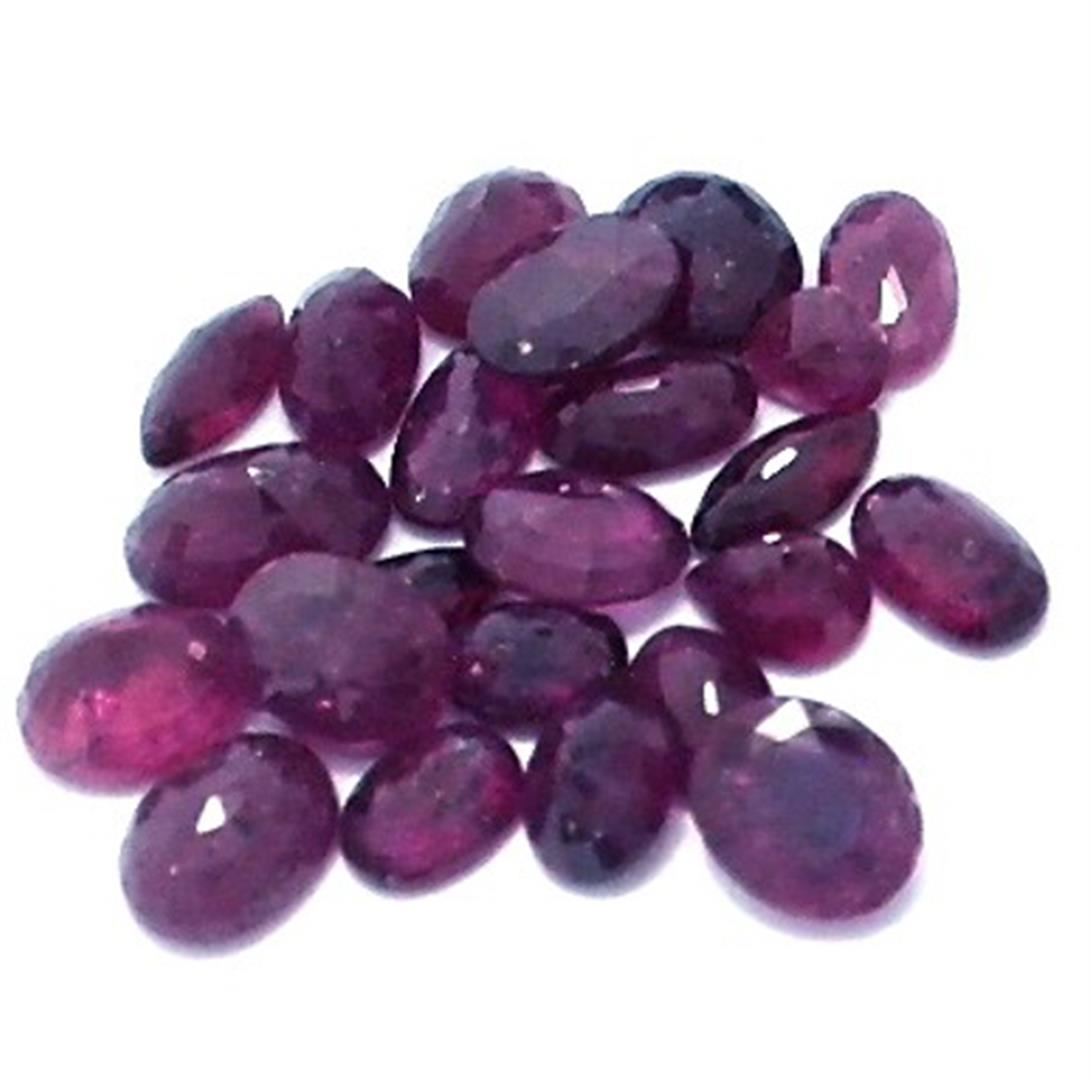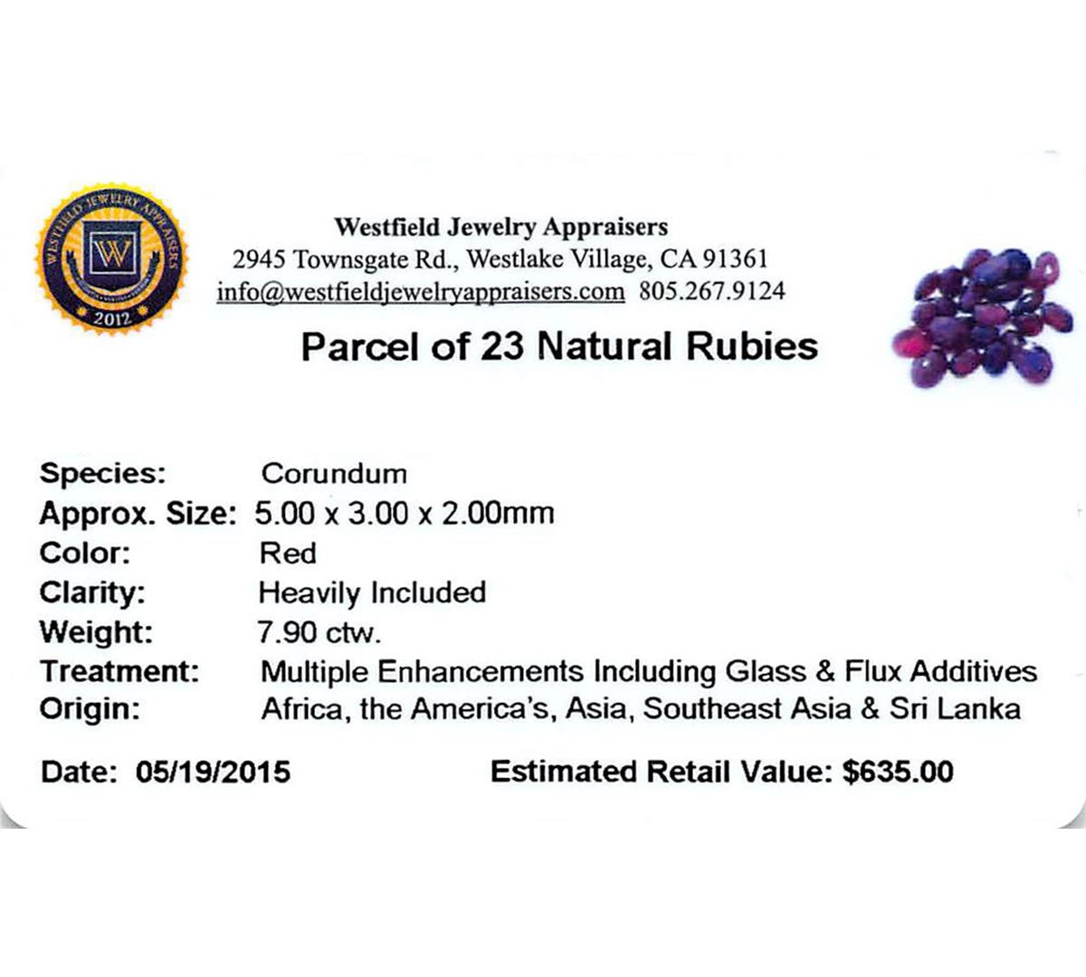 Twenty-three various shapes & sizes cut natural rubies, measuring 5.00 x 3.00 x 2.00mm, exact total weight 7.90ct., clarity is heavily included, type II, dark, very slightly brownish, red color, (GIA R 7/3), cut is good. Measurements are an average for the group. Transmitting light somewhat diffusely, transparent to translucent. Naturally occurring internal & external characteristics are present. Indications of laboratory high temperature heat treatment, with glass & flux additives. Ruby has a low tolerance to rhodium plating, repolishing the surface, & ultrasonic cleaning. Westfield Appraised at $635.00.
