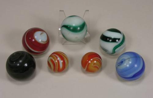 Selection of seven Akro Agate Gear Shift knobs, five large 2 inches diameter, two small, 1 1/4 inches diameter. Good Cond.