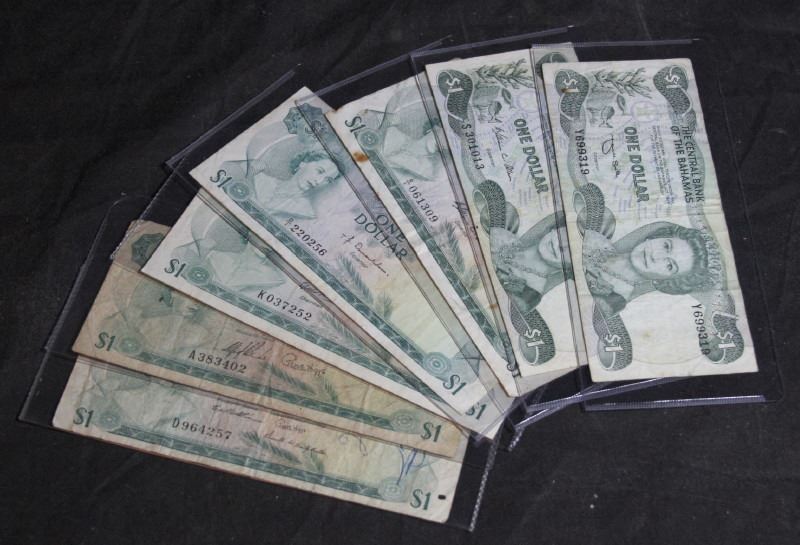 7 Assorted Central Bank of Bahamas $1 One Dollar Bank Notes - 1965 - 2 Sig (VG), 3 Sig (G+), 1968 (VG+), 1974 (Donaldson Sig - F+), 1974 Allen Sig (VG), 1984 Allen Sig (F+), 1984 Smith Sig (VG+)