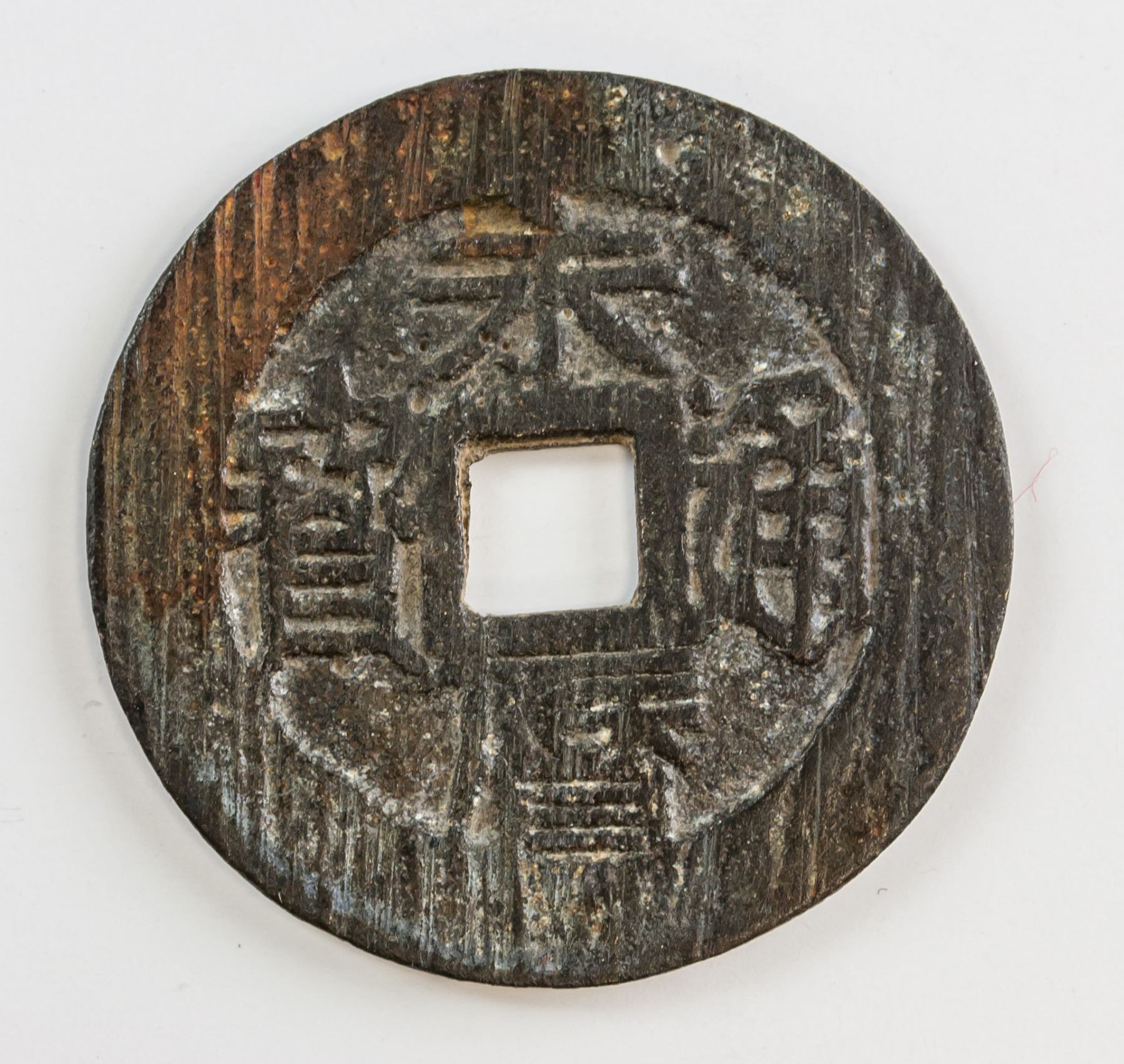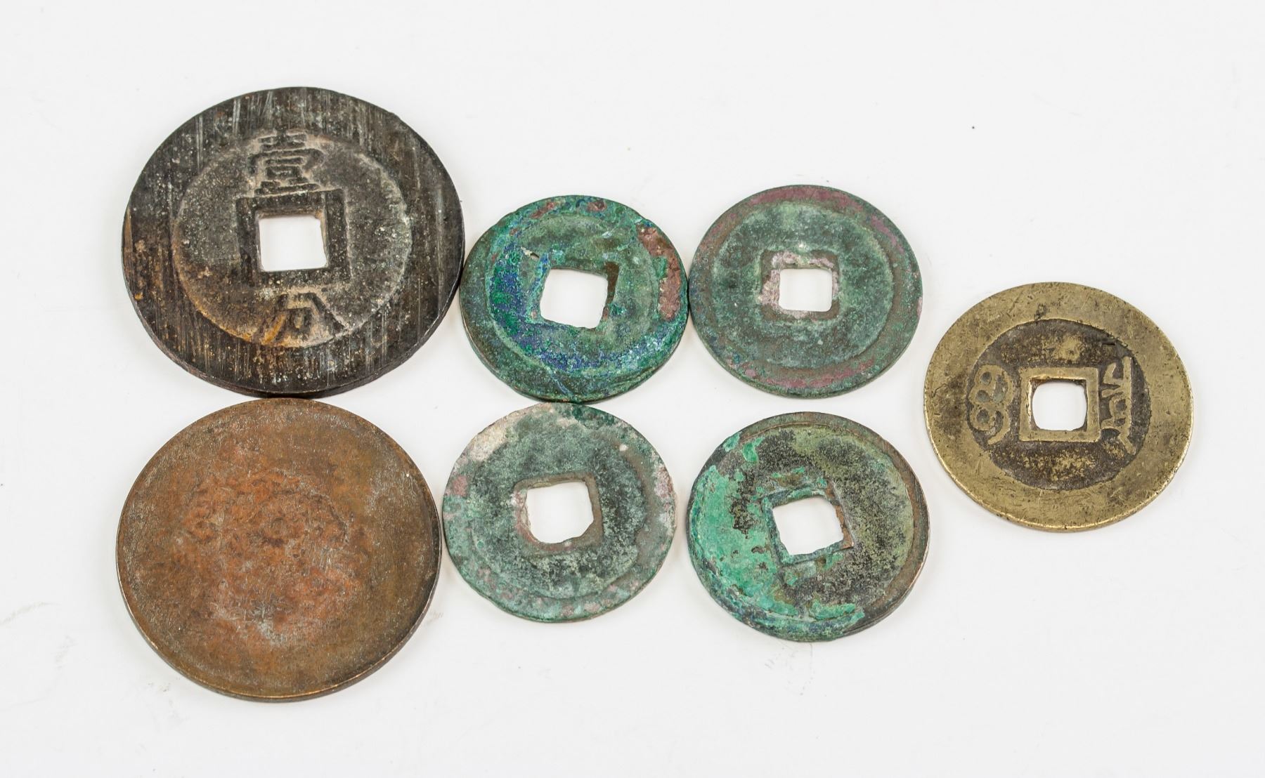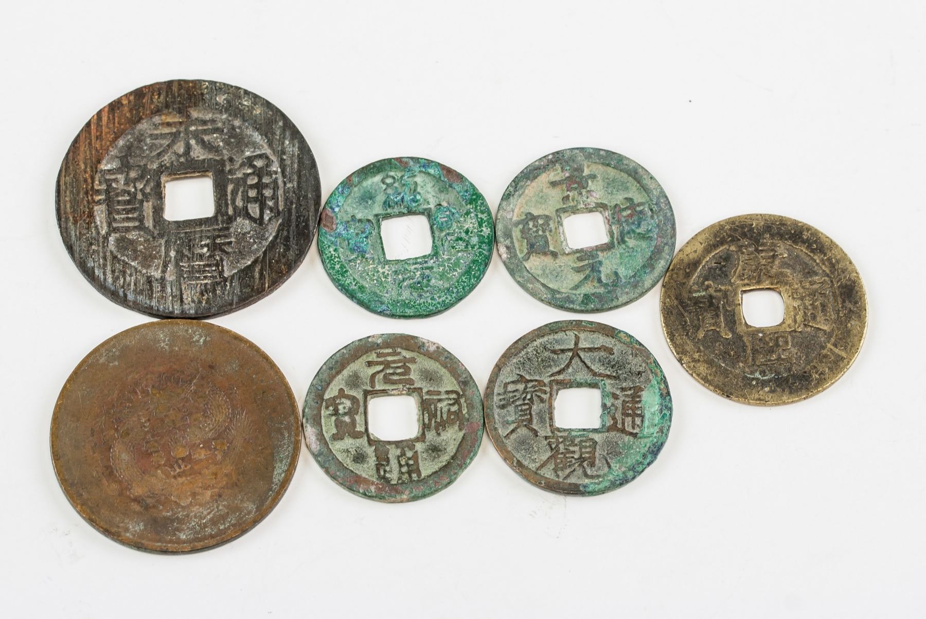 Seven assorted Chinese coins, one 1646-1659 Southern Ming Yongli Tongbao 1 Fen bronze coin (Hartill 21.79), one Qing dynasty Daqing Yinbi copper coin, one 1094-1097 Northern Song Shaosheng Yuanbao bronze coin(Hartill 16.291), one 1107-1110 Northern Song Daguan Tongbao bronze coin (Hartill 16.418), one 1086-1093 Nothern Song Yuanyou Tongbao bronze coin (Hartill 16.262), one 1004-1007 Northern Song Jingde Yuanbao bronze coin (Hartill 16.49), one 1662-1722 Qing Kangxi Tongbao Beijing Mint (Hartill 225), D: 23.85-38.22 mm, 43.36 grams total