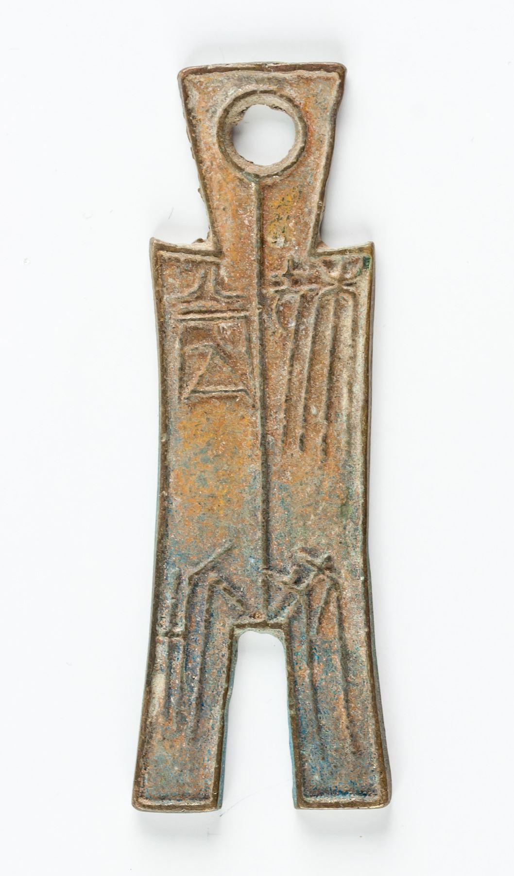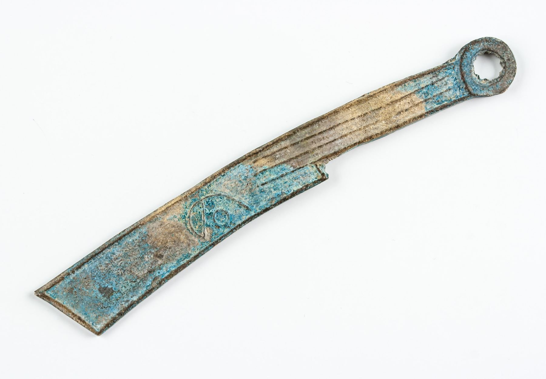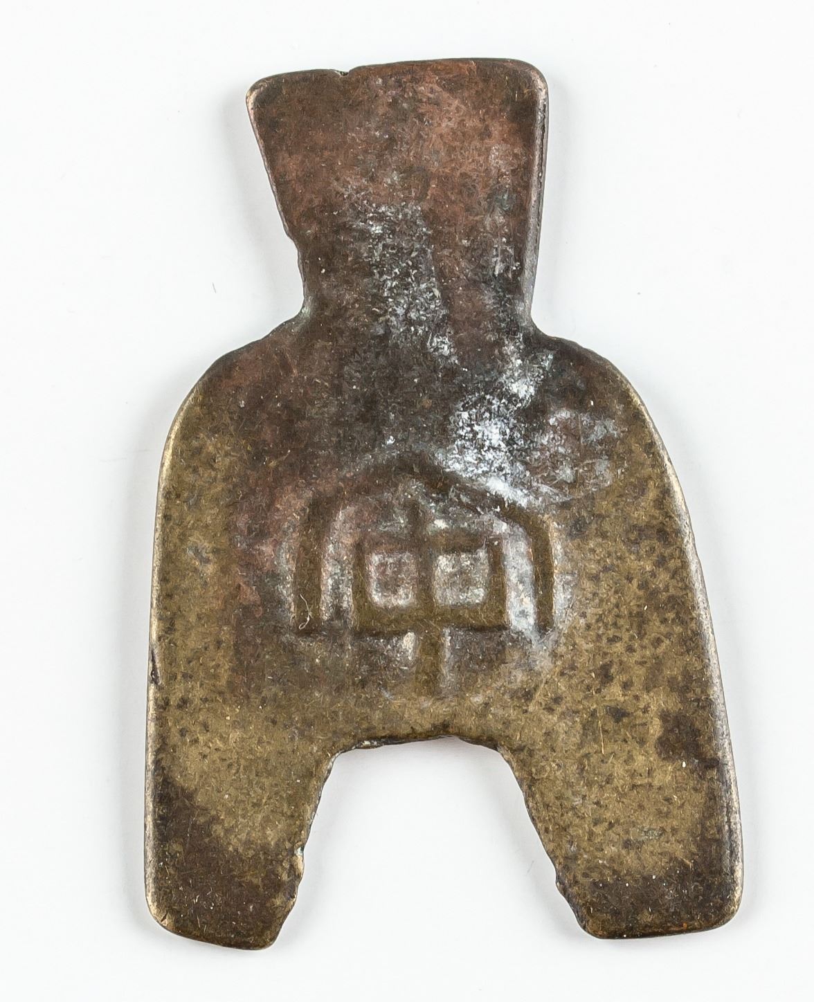 Seven (7) assorted Chinese bronze coins; of 6 spade coins and 1 knife coin; carved with Chinese characters in seal script on surface; H: 4.5-13 cm, W: 1.5-4 cm, 153 grams total