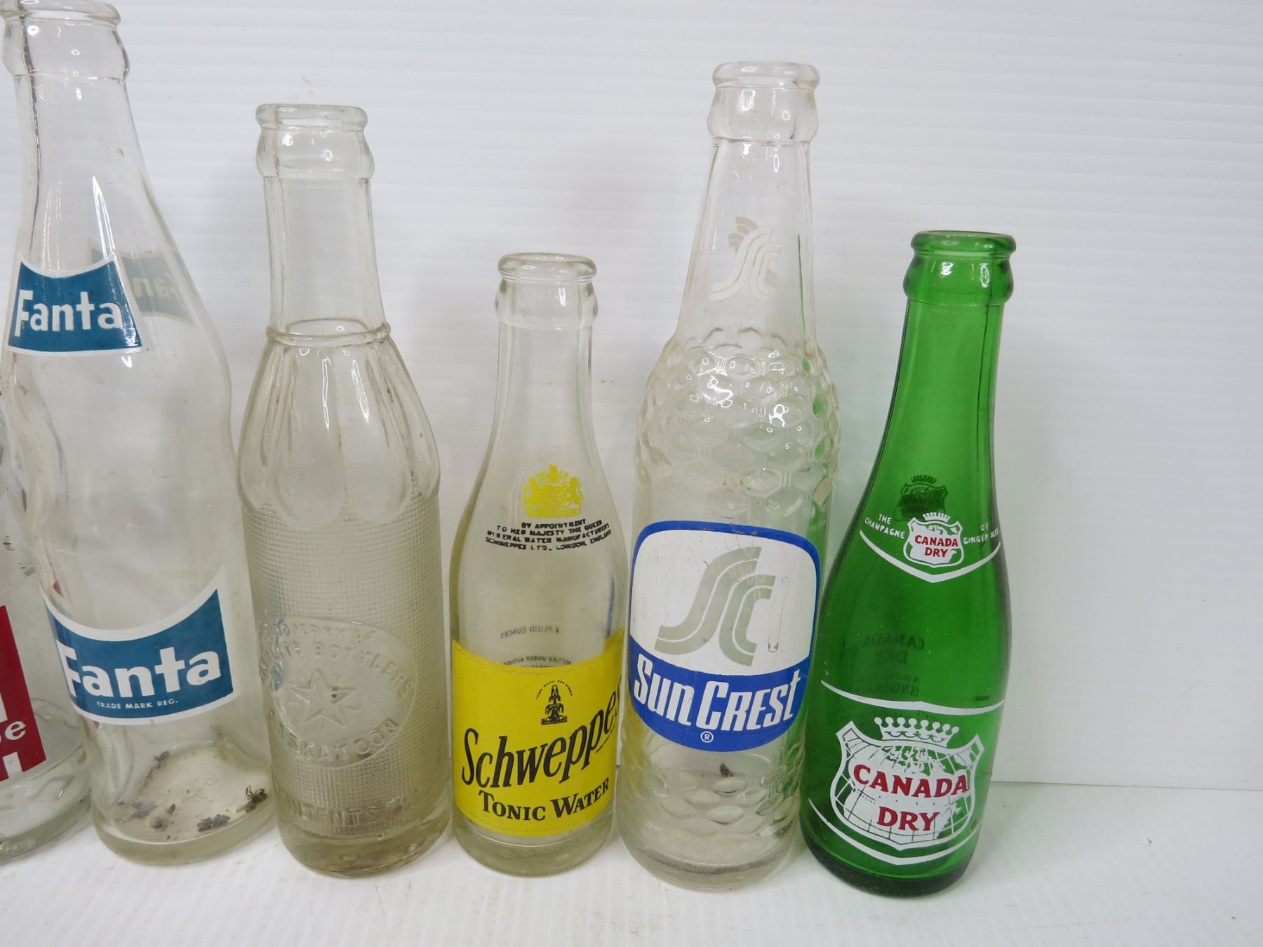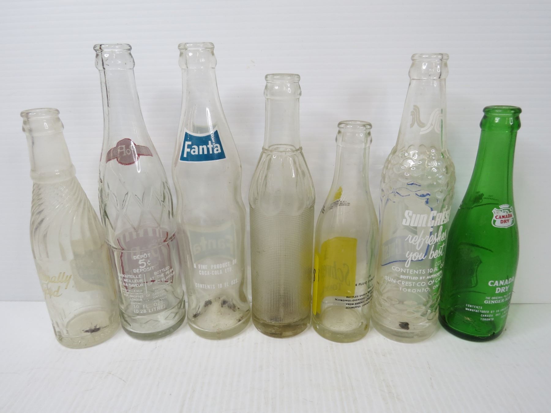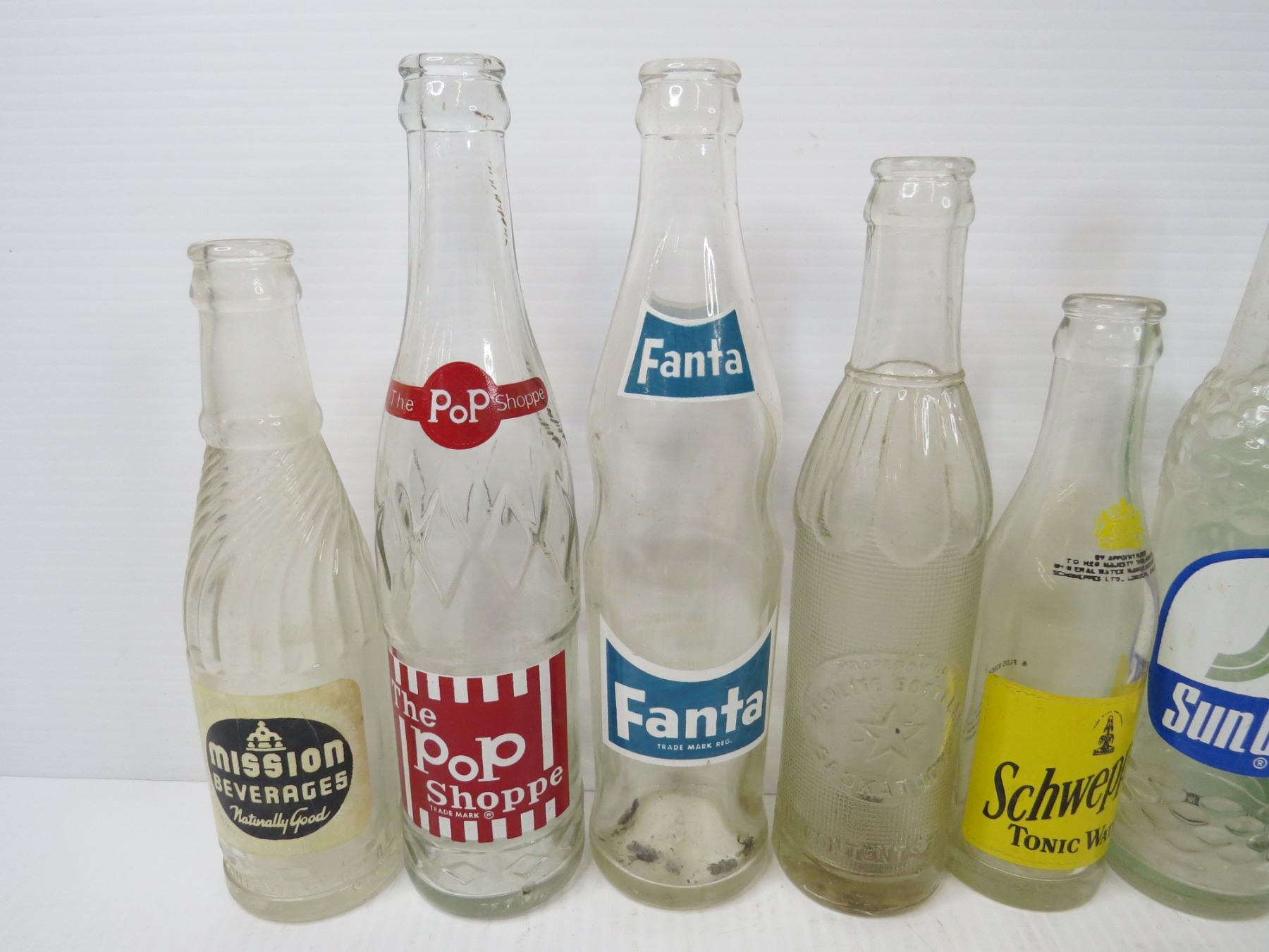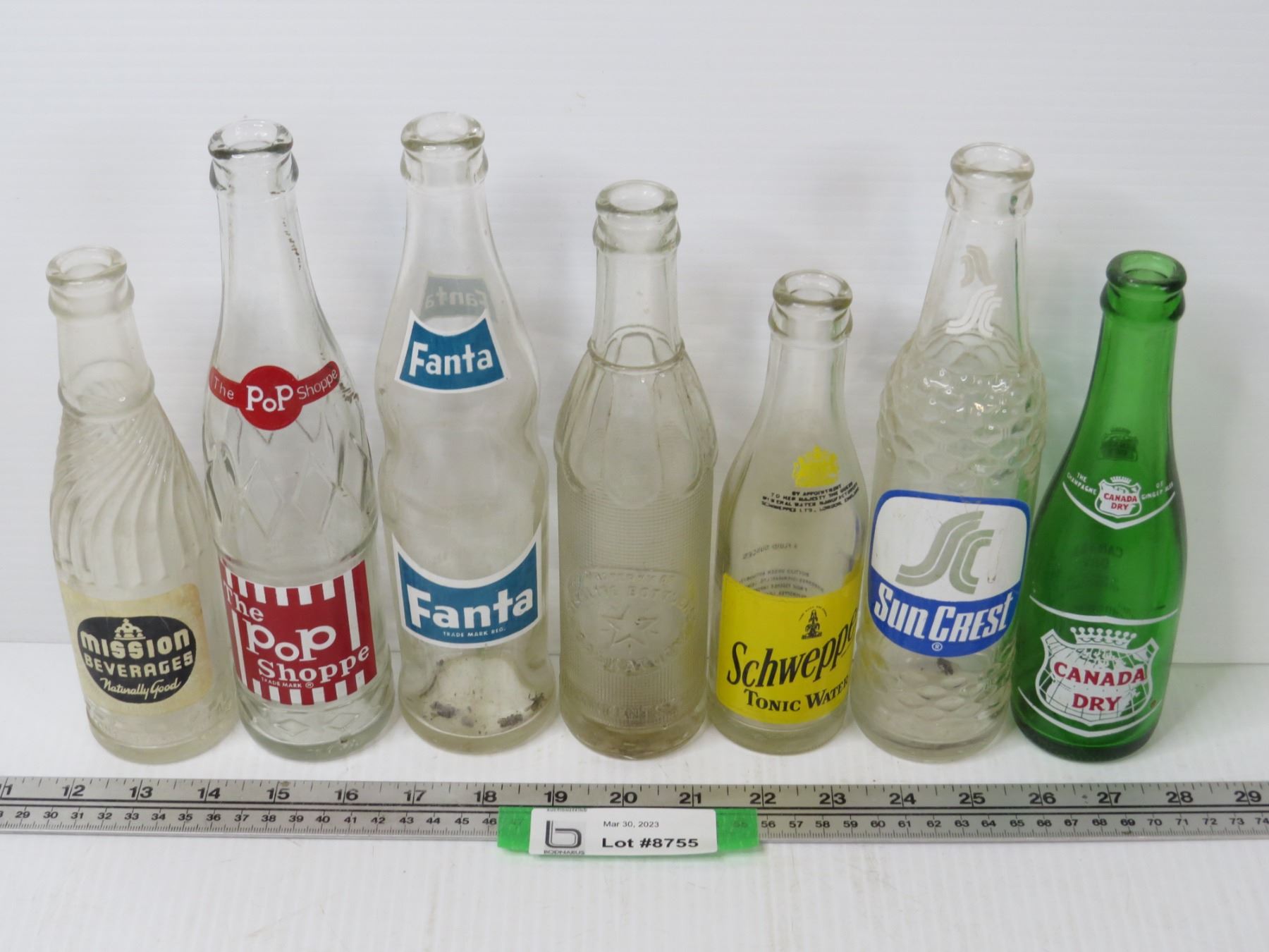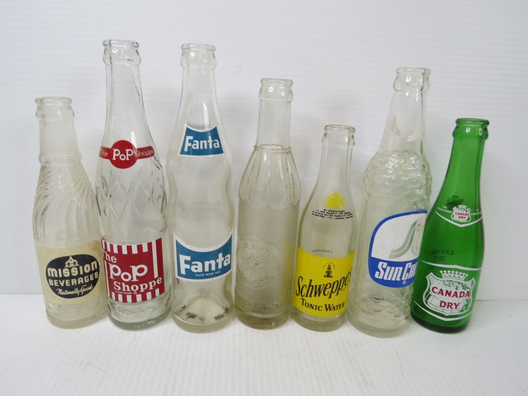 (7) Assorted Soda Bottles - Suncrest - Fanta - PopShoppe - Mission