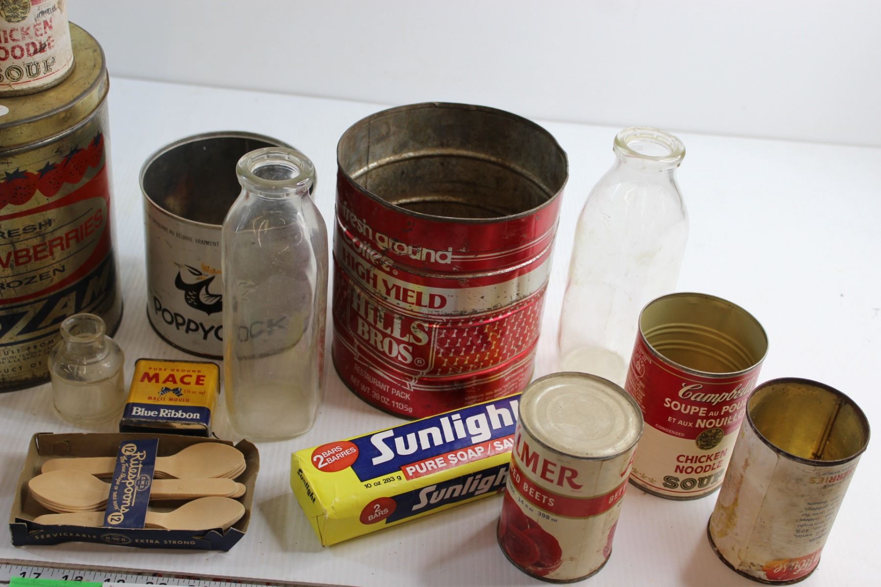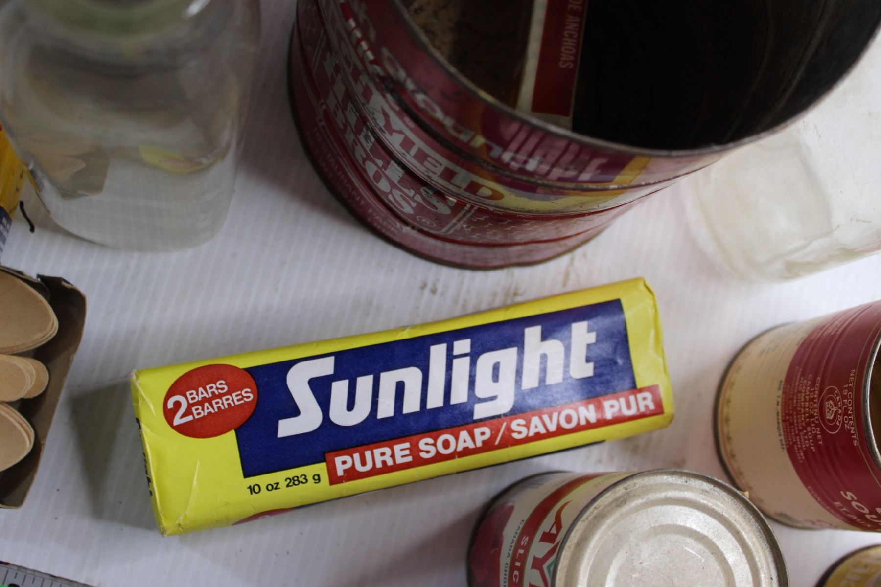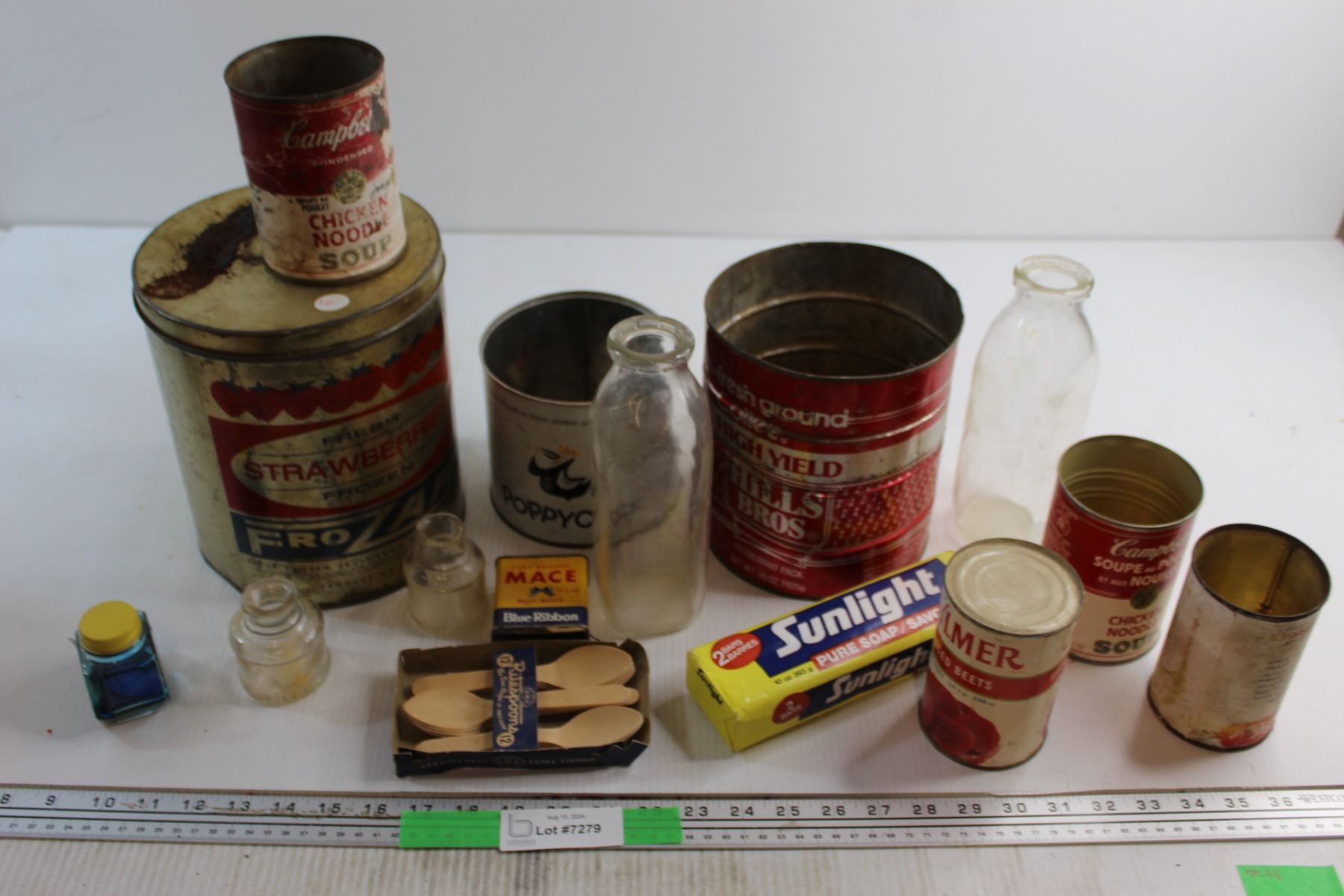 (7) Assorted Vintage Tins, (4) Vintage Bottles, Sunlight Pure Soap and Assorted Vintage Items