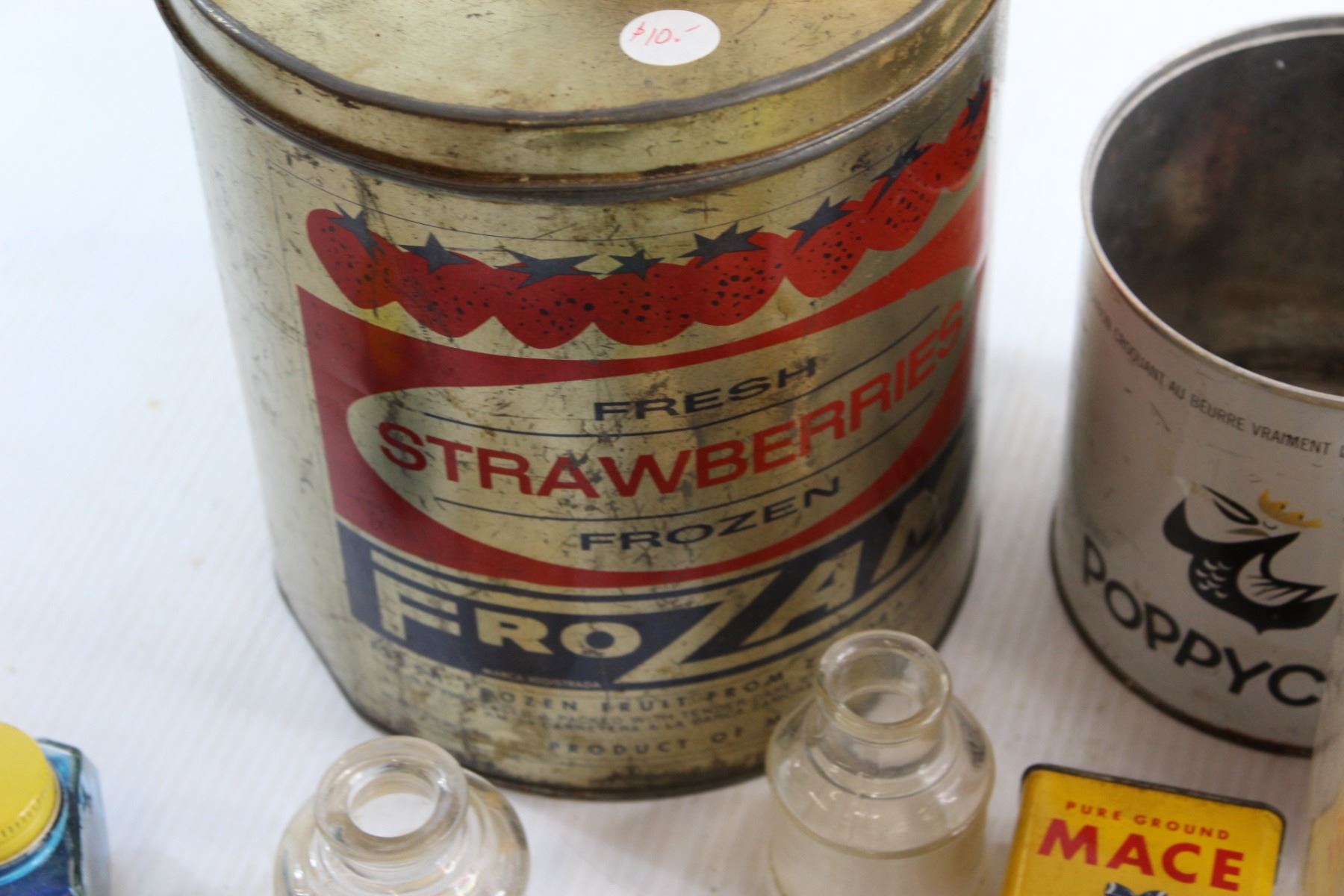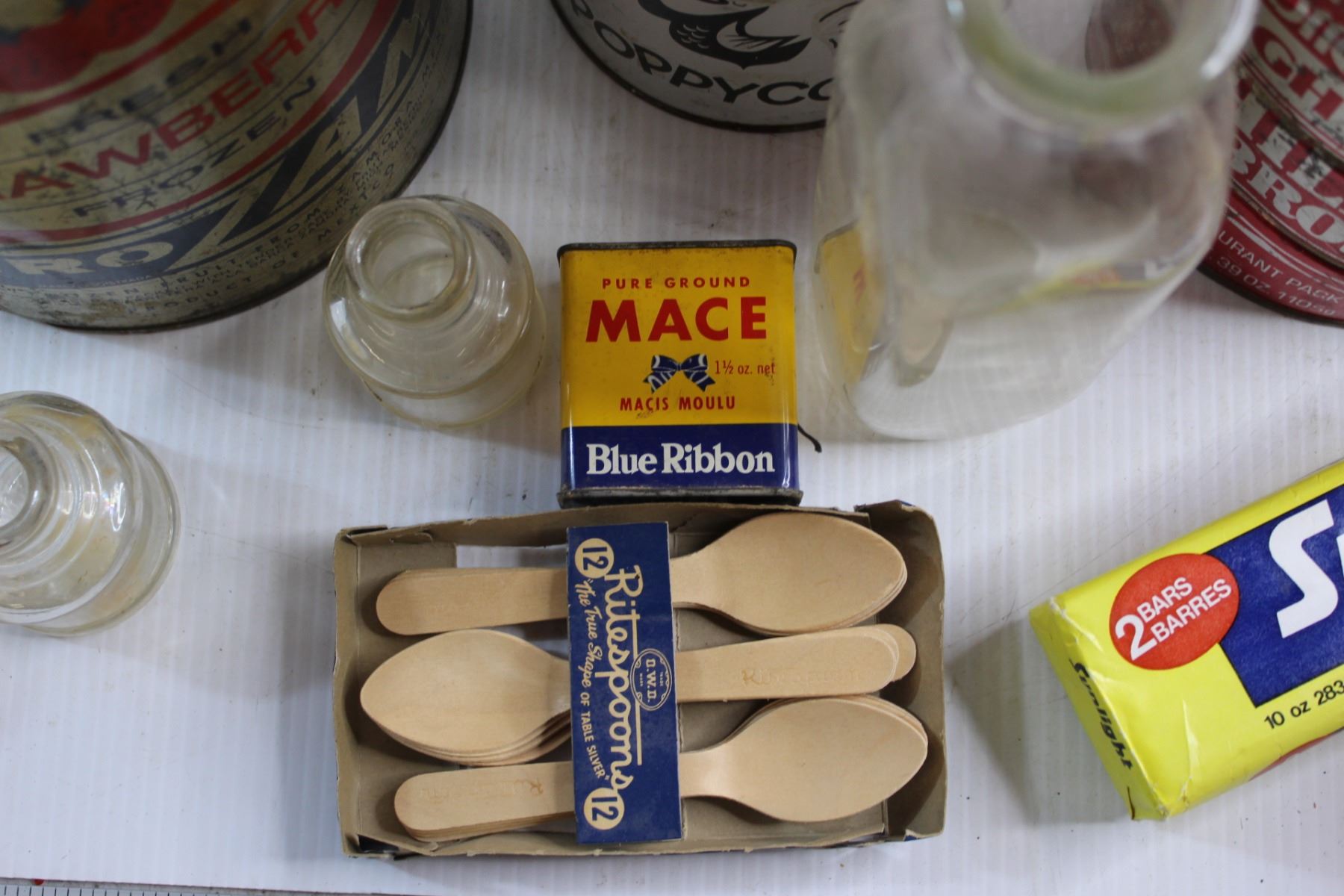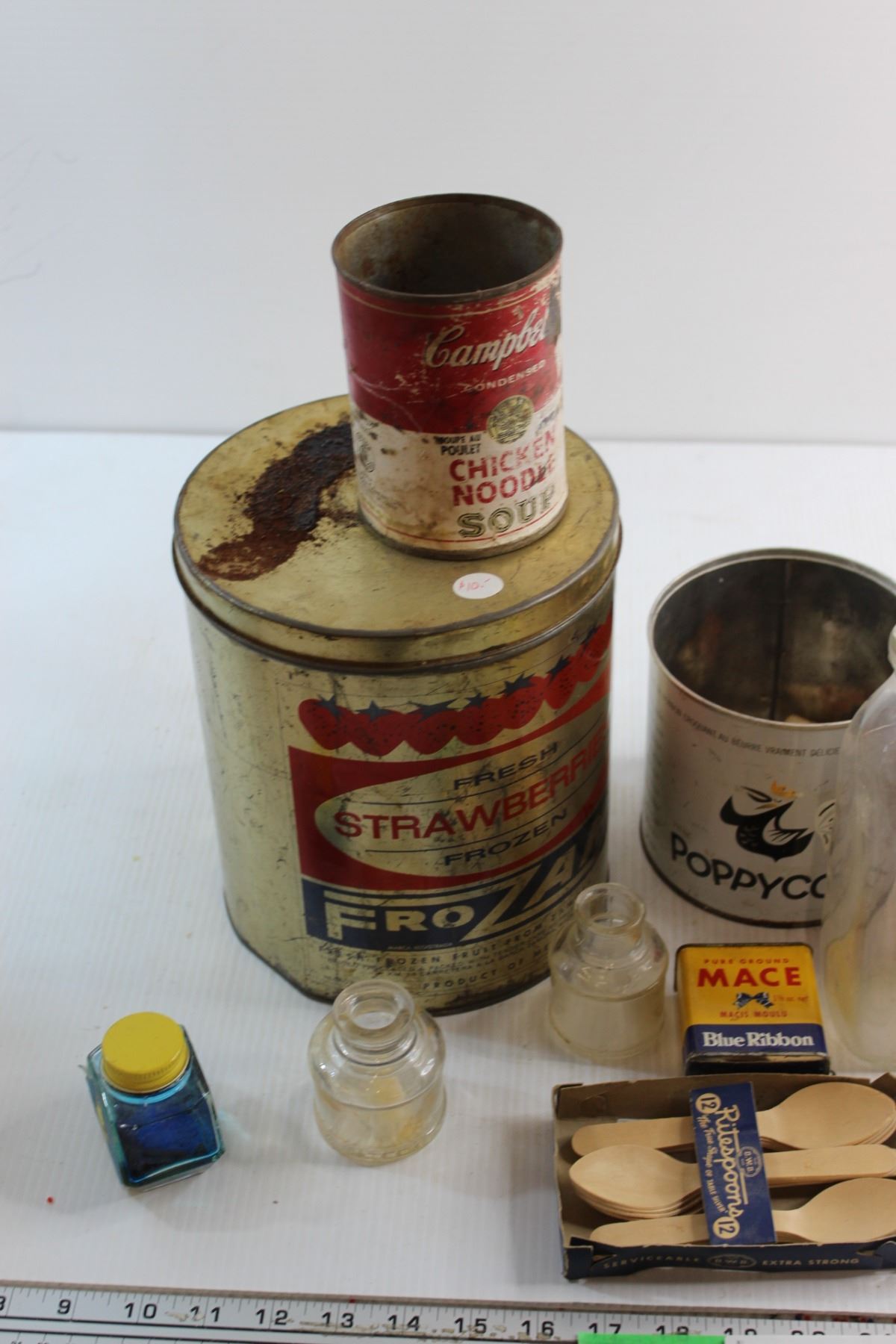 (7) Assorted Vintage Tins, (4) Vintage Bottles, Sunlight Pure Soap and Assorted Vintage Items