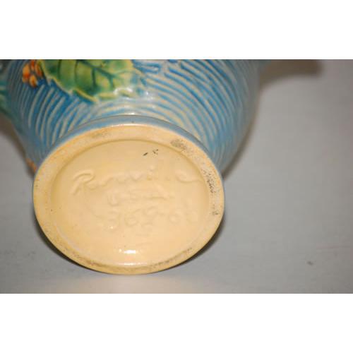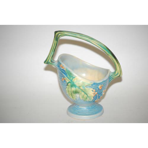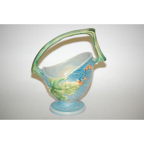 7" BUSHBERRY ROSEVILLE POTTERY BASKET - ROSEVILLE<BR>POTTERY BUSHBERRY PATTERN HANDLED BASKET #369-6 1/2 -<BR>MINOR WEAR, CRAZING & IMPERFECTIONS