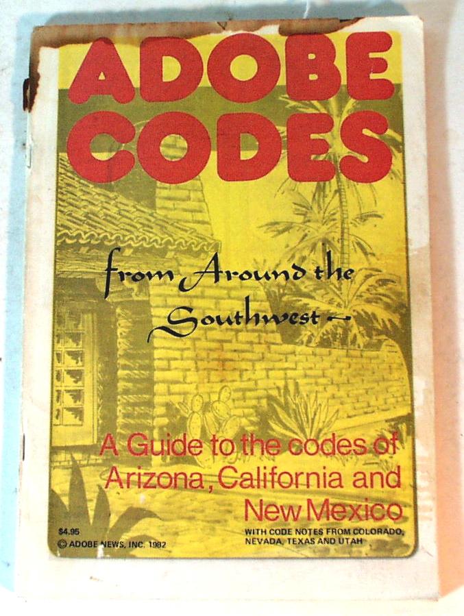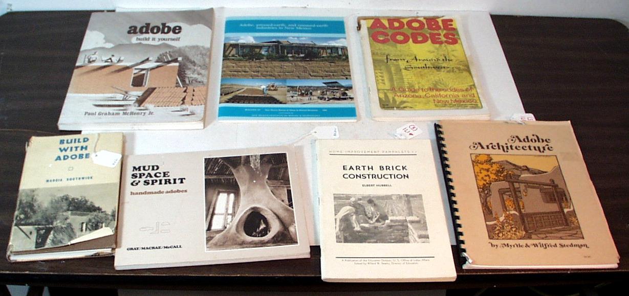 A collection of 7 books covering the process involved in building with Adobe. Early 1970s. Hard and softcover. Good condition. Adobe Codes from Around the Southwest, a guide to the codes of Arizona, California, and New Mexico. 1982. some water staining. 2) Adobe, pressed-earth, and rammed-earth industries in New Mexico. 1989. very good condition. 3) Adobe build it yourself by Paul McHenry. 1974. Good condition. 4) Adobe Architecture by Myrtle and Wilfred Stedman. 1973. Good condition. 5) Earth Brick Construction by Elbert Hubbell. 1943. Good condition. 6) Mud Space and Spirit; handmade adobes by Gray/Macrae/mcCall. 1976. Good condition. 7) Build with Adobe by Marcia Southwick. 1965. Good condition, dust jacket tearing.