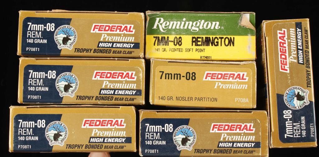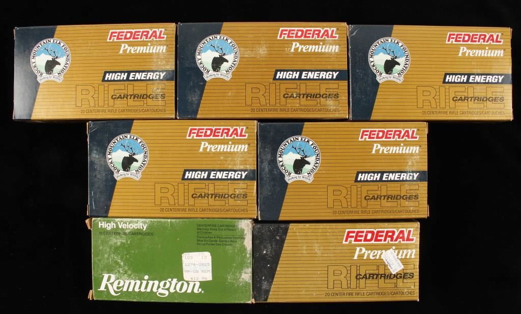 Includes: (5) boxes of Federal Premium High Energy 140 grain Soft Points, (1) box of Federal Premium 140 grain Nosler Partitions and (1) box of Remington High Velocity 140 grain Soft Points.