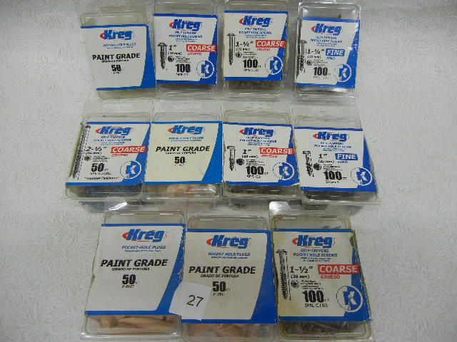 7 Boxes of Pocket Hole Screws: (3) 1", (2) 1 1/4", (2) 1 1/2", and 3 Boxes of Paint Grade Pocket Hole Plugs and Kreg 1" & 1 1/4" Self Tapping Pocket Screws