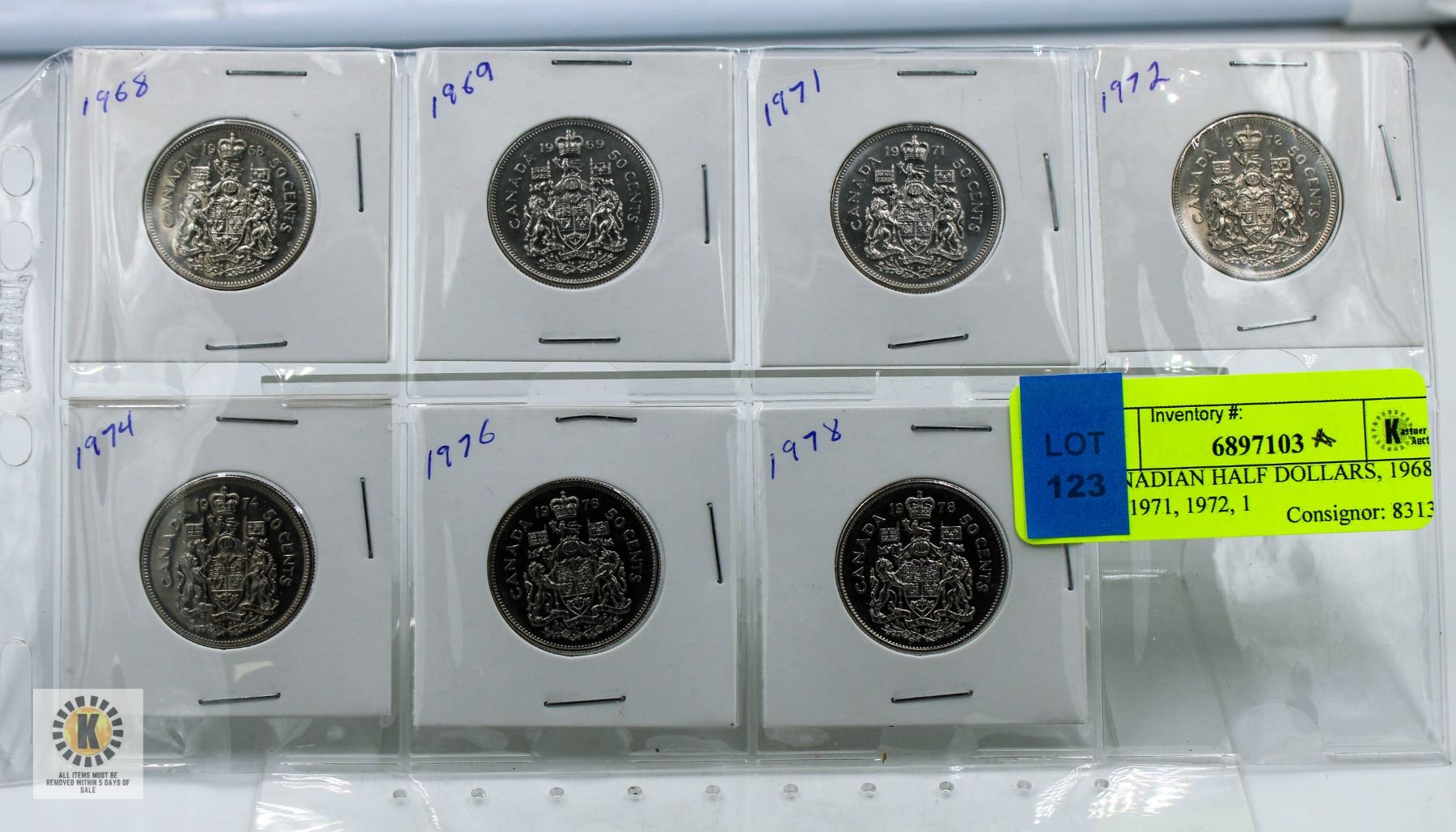 7 CANADIAN HALF DOLLARS, 1968, 1969, 1971, 1972, 1