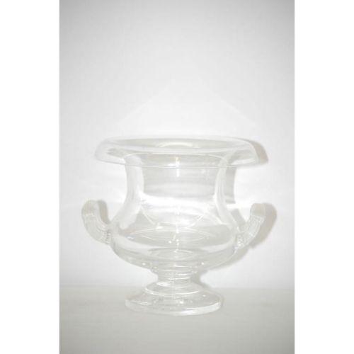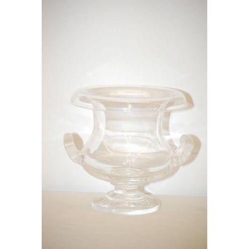 7" CLEAR STEUBEN DOUBLE HANDLED URN W/ ROLLED UPPER LIP, RIBBED APPLIED HANDLES-MARKED STEUBEN W/ ETCHED SIGNATURE ON BASE - BASE SCRATCHES & WEAR, IMPERFECTIONS