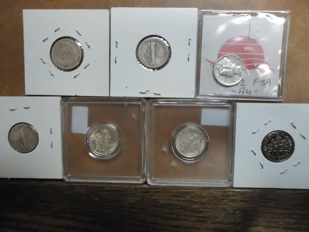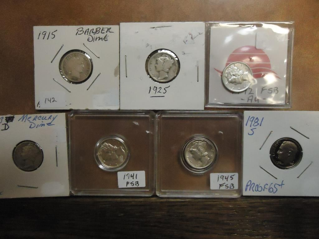 1915 BARBER DIME (FINE), 1925 MERCURY DIME, 1942 AU, 1943-D, 1941 UNC AND 1945 UNC MERCURY DIMES AND 1981-S ROOSEVELT DIME PROOF