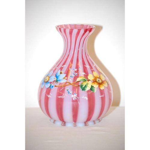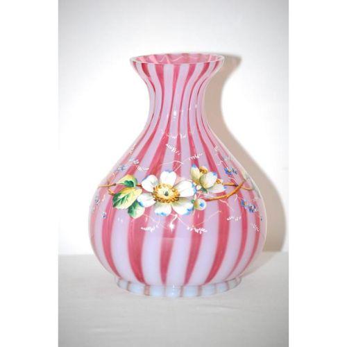 7" CRANBERRY OPALESCENT STRIPED VICTORIAN ART GLASS VASE DECORATED W/ ENAMEL FLORAL GARLAND DECORATION- UNMARKED, BULBOUS BASE W/ PINCHED NECK & FLARED LIP - GROUND CHIP ON TOP LIP, IMPERFECTIONS
