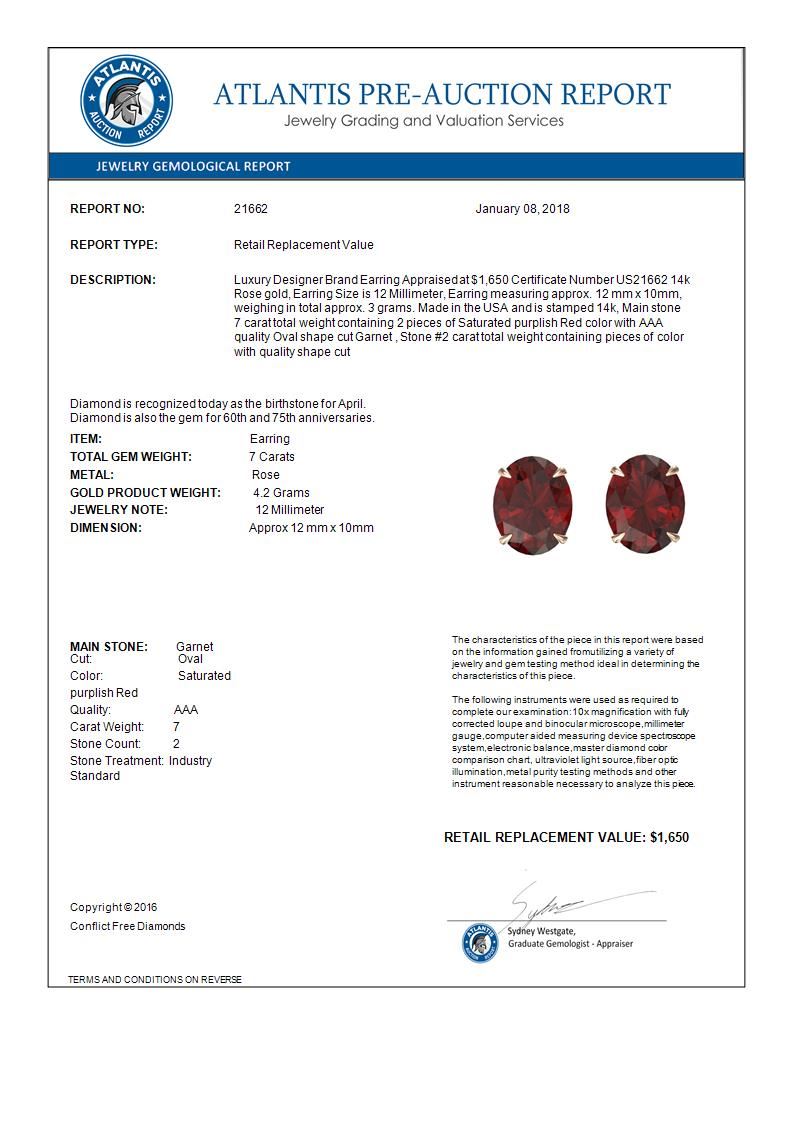 REF-27X6T -21662 ---- 7 CTW Garnet Designer Inspired Solitaire Stud Earrings 14K Rose Gold ---- Luxury Designer Brand Earring Appraised at $1,650 Certificate Number US21662 14k Rose gold, Earring Size is 12 Millimeter, Earring measuring approx. 12 mm x 10mm, weighing in total approx. 3 grams. Made in the USA and is stamped 14k, Main stone 7 carat total weight containing 2 pieces of Saturated purplish Red color with AAA quality Oval shape cut Garnet , Stone #2 carat total weight containing pieces of color with quality shape cut