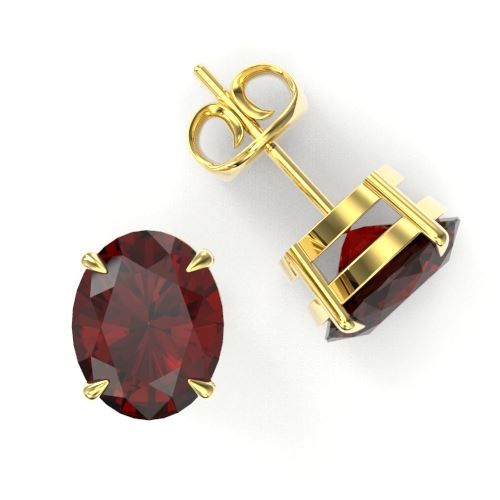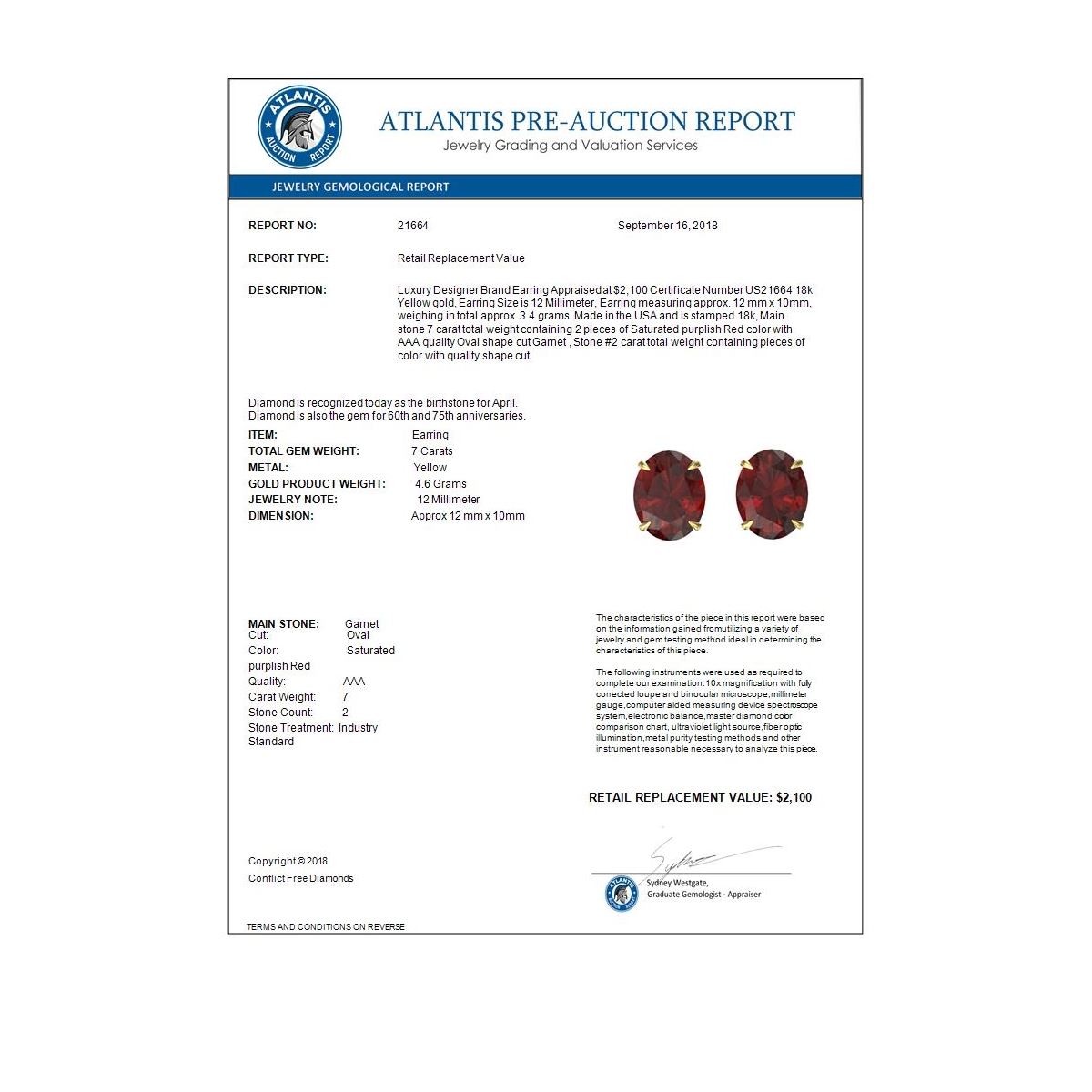 REF-34F9N -21664 ---- 7 CTW Garnet Designer Inspired Solitaire Stud Earrings 18K Yellow Gold ---- Luxury Designer Brand Earring Appraised at $2,100 Certificate Number US21664 18k Yellow gold, Earring Size is 12 Millimeter, Earring measuring approx. 12 mm x 10mm, weighing in total approx. 3.4 grams. Made in the USA and is stamped 18k, Main stone 7 carat total weight containing 2 pieces of Saturated purplish Red color with AAA quality Oval shape cut Garnet , Stone #2 carat total weight containing pieces of color with quality shape cut
