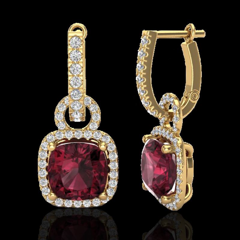 REF-100N8Y -22965 ---- 7 CTW Garnet & Micro Pave VS/SI Diamond Earrings 18K Yellow Gold ---- Luxury Designer Brand Earring Appraised at $7,200 Certificate Number US22965 18k Yellow gold, Earring Size is 1 Inches, Earring measuring approx. 1" X 7/16" , weighing in total approx. 5.8 grams. Made in the USA and is stamped 18k, Main stone 6.25 carat total weight containing 2 pieces of Saturated purplish Red color with AAA quality Cushion shape cut Garnet , Stone #2 0.75 carat total weight containing 84 pieces of H-I color with VS/SI quality Round shape cut Diamond