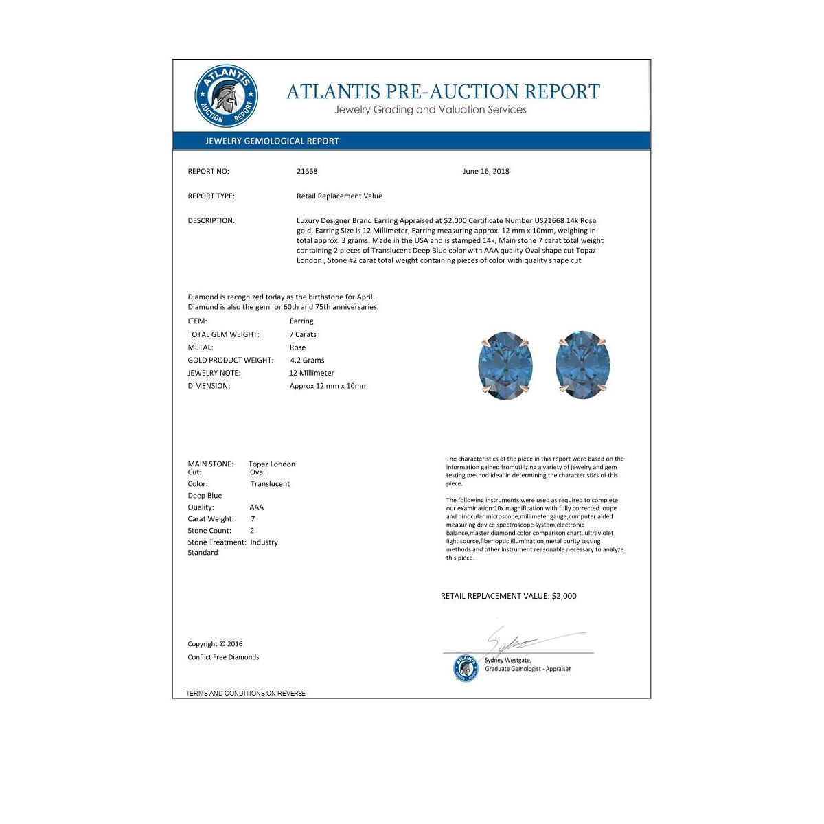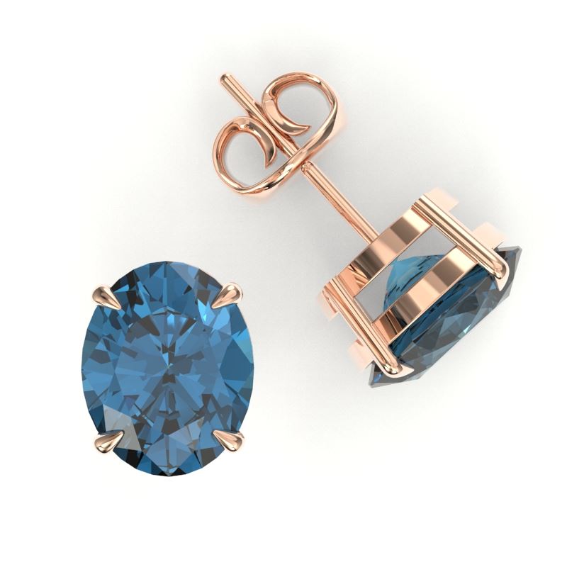 REF-30N2Y -21668 ---- 7 CTW London Blue Topaz Designer Inspired Stud Earrings 14K Rose Gold ---- Luxury Designer Brand Earring Appraised at $2,000 Certificate Number US21668 14k Rose gold, Earring Size is 12 Millimeter, Earring measuring approx. 12 mm x 10mm, weighing in total approx. 3 grams. Made in the USA and is stamped 14k, Main stone 7 carat total weight containing 2 pieces of Translucent Deep Blue color with AAA quality Oval shape cut Topaz London , Stone #2 carat total weight containing pieces of color with quality shape cut