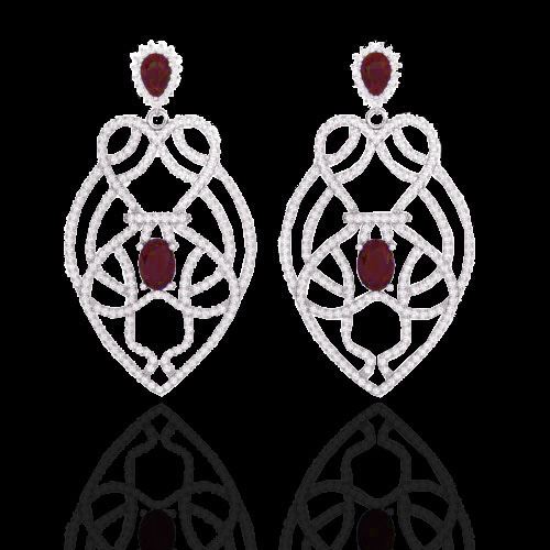 REF-381W8F -21138 ---- 7 CTW Ruby & Micro VS/SI Diamond Heart Earrings Designer Solitaire 14K White Gold ---- Luxury Designer Brand Earring Appraised at $27,300 Certificate Number US21138 14k White gold, Earring Size is 2 Inches, Earring measuring approx. 2" x 1" , weighing in total approx. 16 grams. Made in the USA and is stamped 14k, Main stone 2.2 carat total weight containing 2 pieces of Mid-Opaque-Deep Red color with AAA quality Oval shape cut Ruby , Stone #2 1 carat total weight containing 2 pieces of Strong Red color with Mid-Opaque quality Pear shape cut Ruby , Stone #3 3.8 carat total weight containing 454 pieces of G-H color with VS/SI quality Round shape cut Diamond