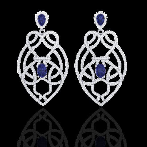 REF-381M8H -21143 ---- 7 CTW Tanzanite & Micro VS/SI Diamond Heart Earrings Solitaire 14K White Gold ---- Luxury Designer Brand Earring Appraised at $29,400 Certificate Number US21143 14k White gold, Earring Size is 2 Inches, Earring measuring approx. 2" x 1" , weighing in total approx. 16 grams. Made in the USA and is stamped 14k, Main stone 2.2 carat total weight containing 2 pieces of Intense Violet Blue color with AAA quality Oval shape cut Tanzanite , Stone #2 1 carat total weight containing 2 pieces of Intense Blusih Purple color with AA quality Pear shape cut Tanzanite , Stone #3 3.8 carat total weight containing 454 pieces of G-H color with VS/SI quality Round shape cut Diamond