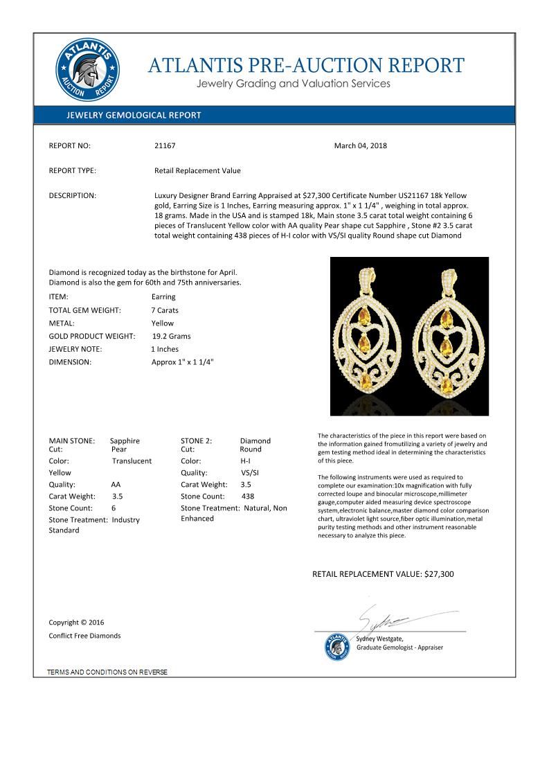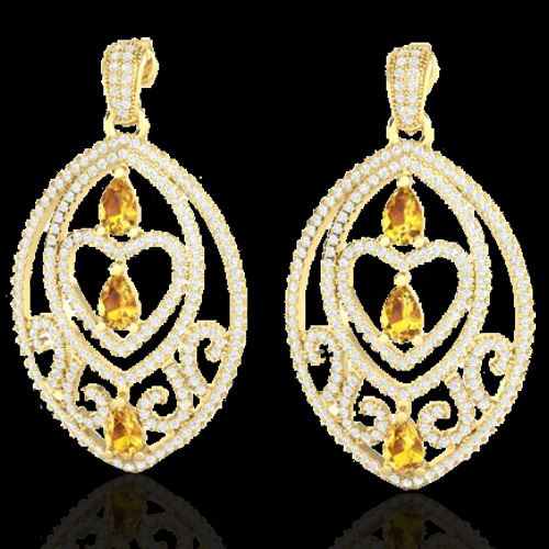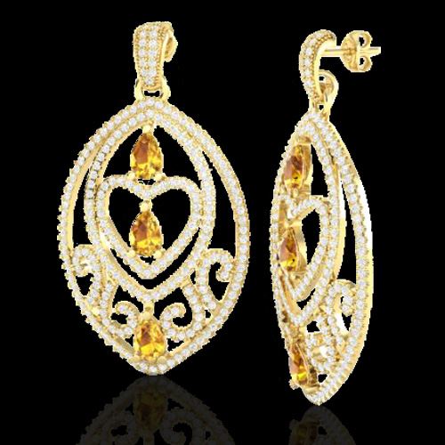 REF-381T8M -21167 ---- 7 CTW Yellow Sapphire & Micro Pave VS/SI Diamond Heart Earrings 18K Yellow Gold ---- Luxury Designer Brand Earring Appraised at $27,300 Certificate Number US21167 18k Yellow gold, Earring Size is 1 Inches, Earring measuring approx. 1" x 1 1/4" , weighing in total approx. 18 grams. Made in the USA and is stamped 18k, Main stone 3.5 carat total weight containing 6 pieces of Translucent Yellow color with AA quality Pear shape cut Sapphire , Stone #2 3.5 carat total weight containing 438 pieces of H-I color with VS/SI quality Round shape cut Diamond