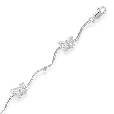 6x9mm pave CZ butterflies and 2.6mm round CZs are separated by 13mm wavy links. Features a lobster clasp. .925 Sterling Silver