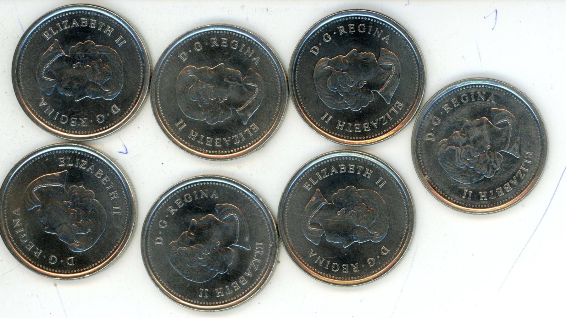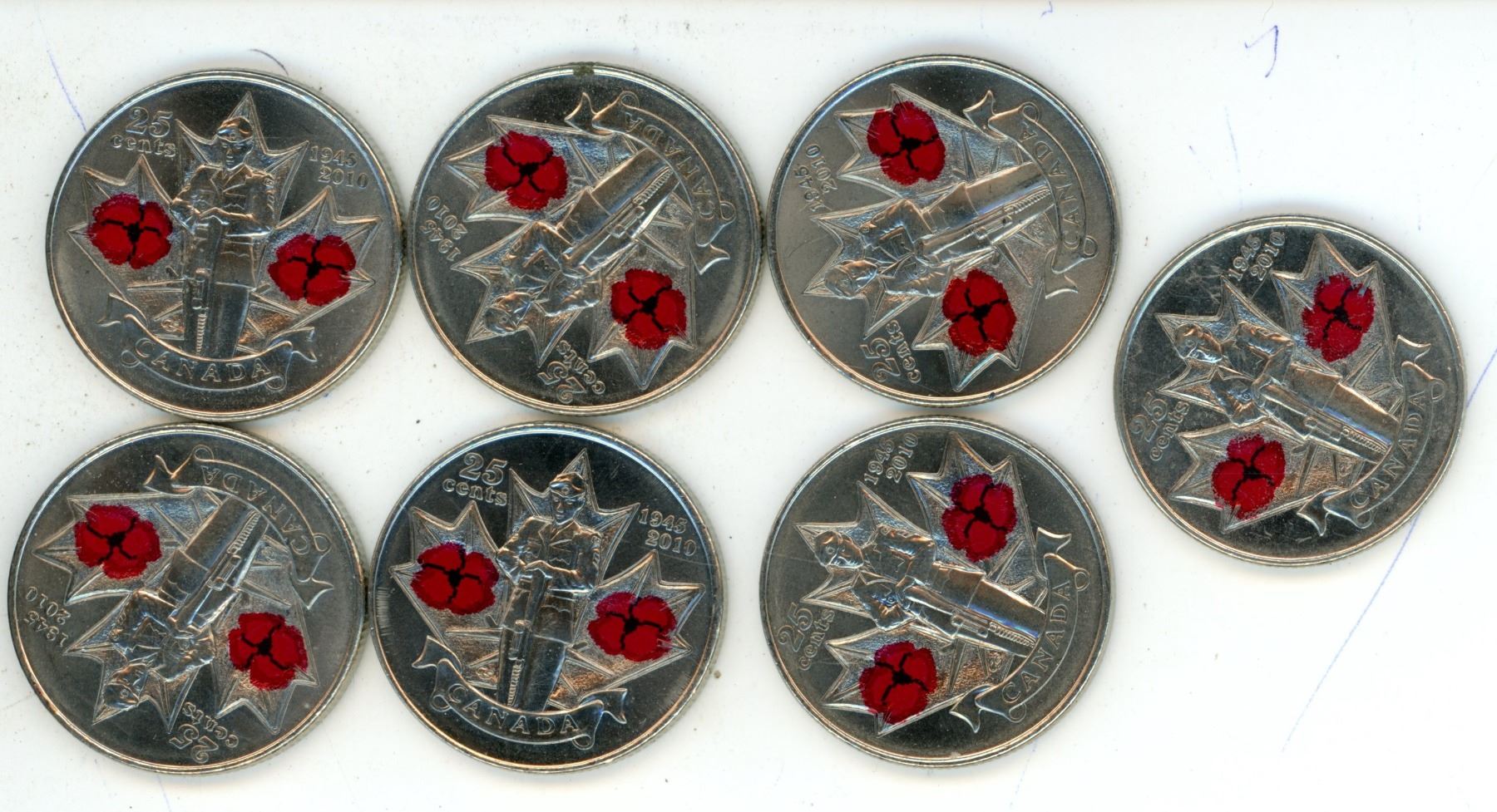 (7) Canadian 25 Cent Coins 1945-2010 Double Poppy Veteran Colored Design