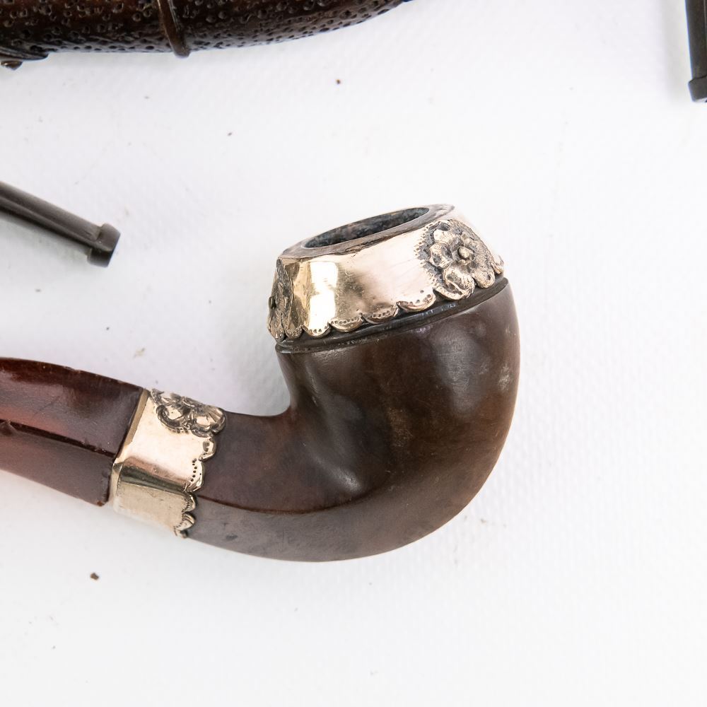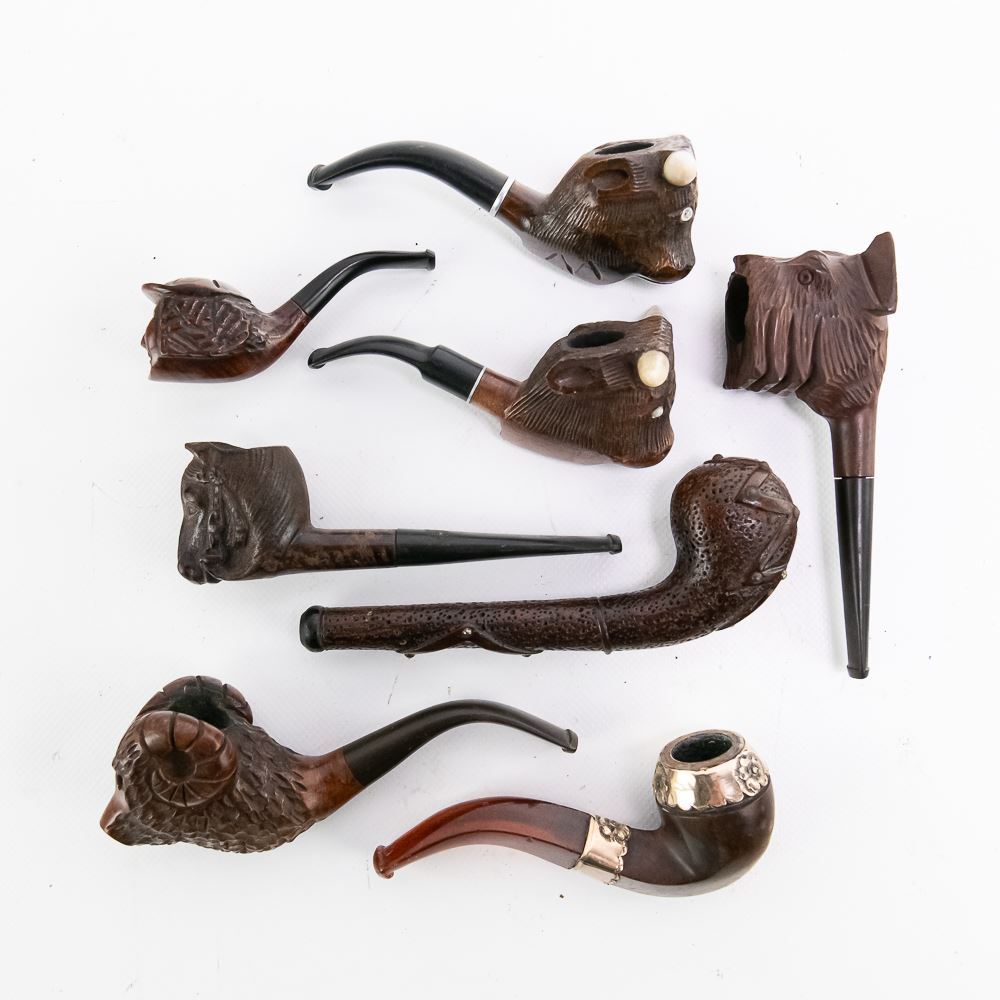 Lot includes a rams head missing one glass eye, 2 bulls, 1 horse head, 1 scottie dog, a Quaker head with chipped bowl, and a briar bowl with gold ferrule and bowl rim with a bakelite stem. Also included int he lot is a carved wood umbrella handle.