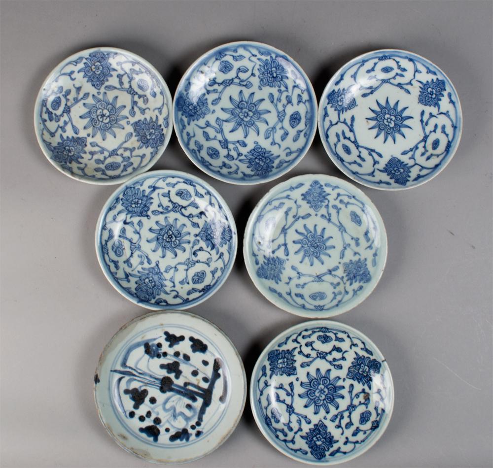 All painted to depict various decorations including lotus blossoms and symbols, each with seal mark in underglaze blue to foot rim, largest is 6"D, 3 plates with rim chips, circa 17th century.