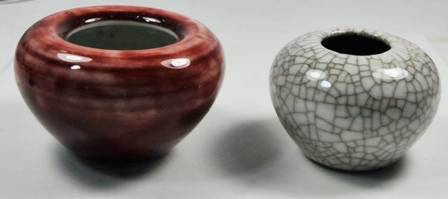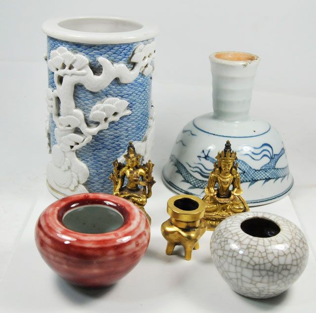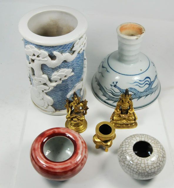 2 bronze figures. Small urn. 1 blue & white porcelain brush holder depicting "Foo Dogs", approx. 6" H. 1 porcelain steam cup. 2 small brush washers. Please read our terms of sale.