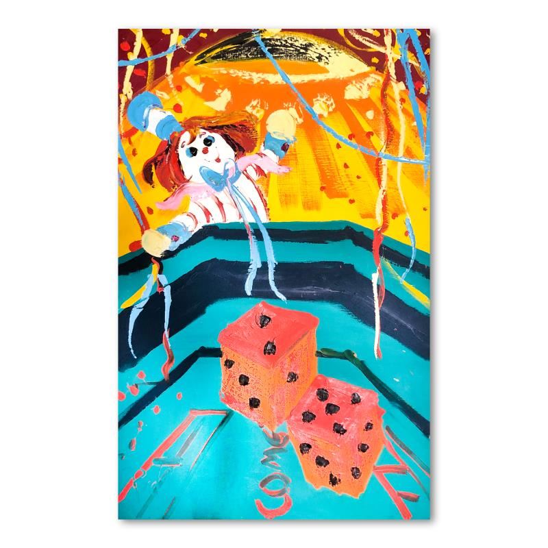 7 Come 11 By Henrie (1932-1999). "7 Come 11" is an original oil painting on stretched canvas by Paul Blaine Henrie (1932-1999). The piece is hand signed by the artist and comes with a letter of authenticity. Please note that due to the age of this piece and the way it was stored, there are minor sings of wear, particularly on the corners and edges. Measures approximately. 48" x 30" (image).