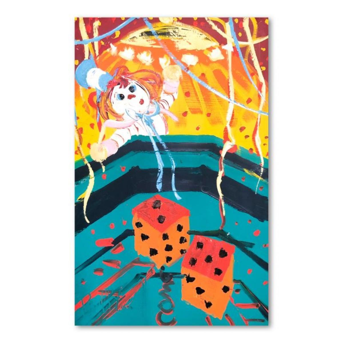 7 Come 11 by Henrie (1932-1999). "7 Come 11" is an original oil painting on stretched canvas by Paul Blaine Henrie (1932-1999). The piece is hand signed by the artist and comes with a letter of authenticity. Please note that due to the age of this piece and the way it was stored, there are minor sings of wear, particularly on the corners and edges. Measures approximately. 48" x 30" (image).