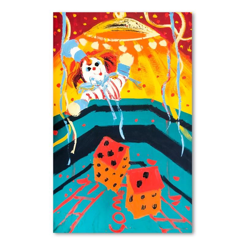 "7 Come 11" is an original oil painting on stretched canvas by Paul Blaine Henrie (1932-1999). The piece is hand signed by the artist and comes with a letter of authenticity. Please note that due to the age of this piece and the way it was stored, there are minor sings of wear, particularly on the corners and edges. Measures approximately. 48" x 30" (image).