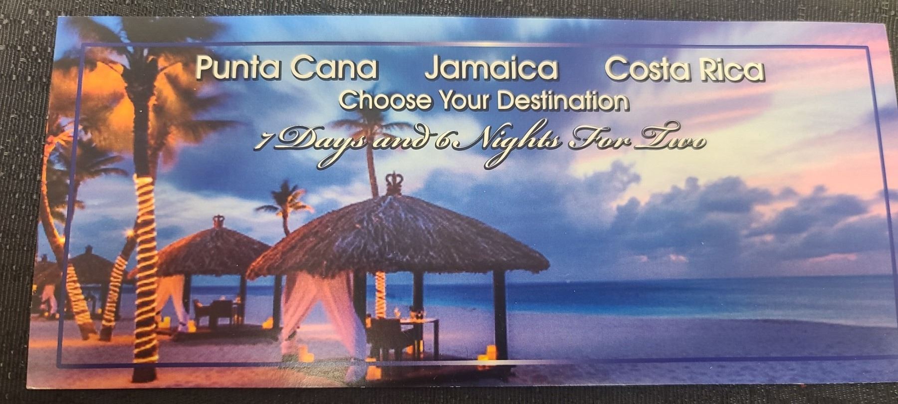 THIS 7 DAY, 6 NIGHT GETAWAY PROVIDES TWO ADULTS WITH DELUXE ACCOMIDATIONNS IN PUNTA CAN, JAMAICA, OR COSTA RICA! TERMS AND CONDITIONS THIS VOUCHER IS VALID FOR A RESERVATION REQUEST FORM WHICH PROVIDES YOU AND A GUEST 7 DAYS ND 6 NIGHTS ACCOMIDATIONS ON YOUR COICE OF ISLAND. THE OPTION TO UPGRADE TO AN ALL-INCLUSIVE GETAWAY IS AVAILABLE AT AN EXTRA COST. AFTER YOU RECIEVE THE RESERVATION REQUEST FORM, YOUR COST IS JUST A FEE TO COER ROOM TAXES OF $30 ER NIGHT. RESERVATIONS MUST BE BOOKED AT LEAST 60 DAYS IN ADVANCE. DATES NEAR HOLIDAY PERIODS AND SPRING BREAK ARE NOT AVAILABLE. TRANSPORTATION, MEALS AND ROOM TAXES ARE NOT INCLUDED. HOLIDAYS AND TRAVEL WITHIN 60 DAYS REQUIRES PAYMENT OF A SURCHARGE. NOT VALID FOR CONVENTIONS OR ANY GROUP TRAVEL. ONLY ONE CERTIFICATE CAN BE USED PER FAMILY IN ANY 12 MONTH PERIOD. FLIGHTS NOT INCLUDED VACCATION PACKAGE EXP: 9/30/2023