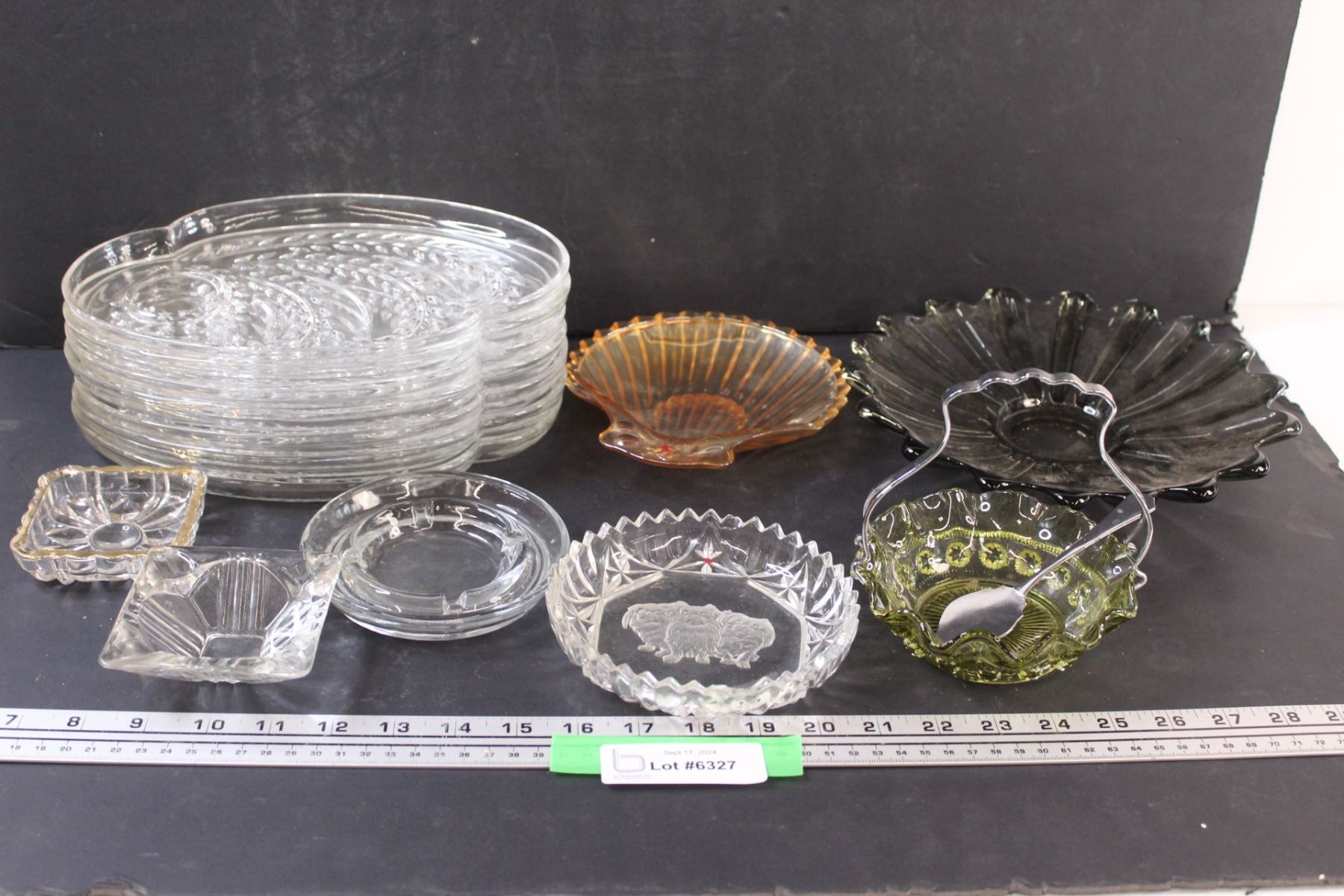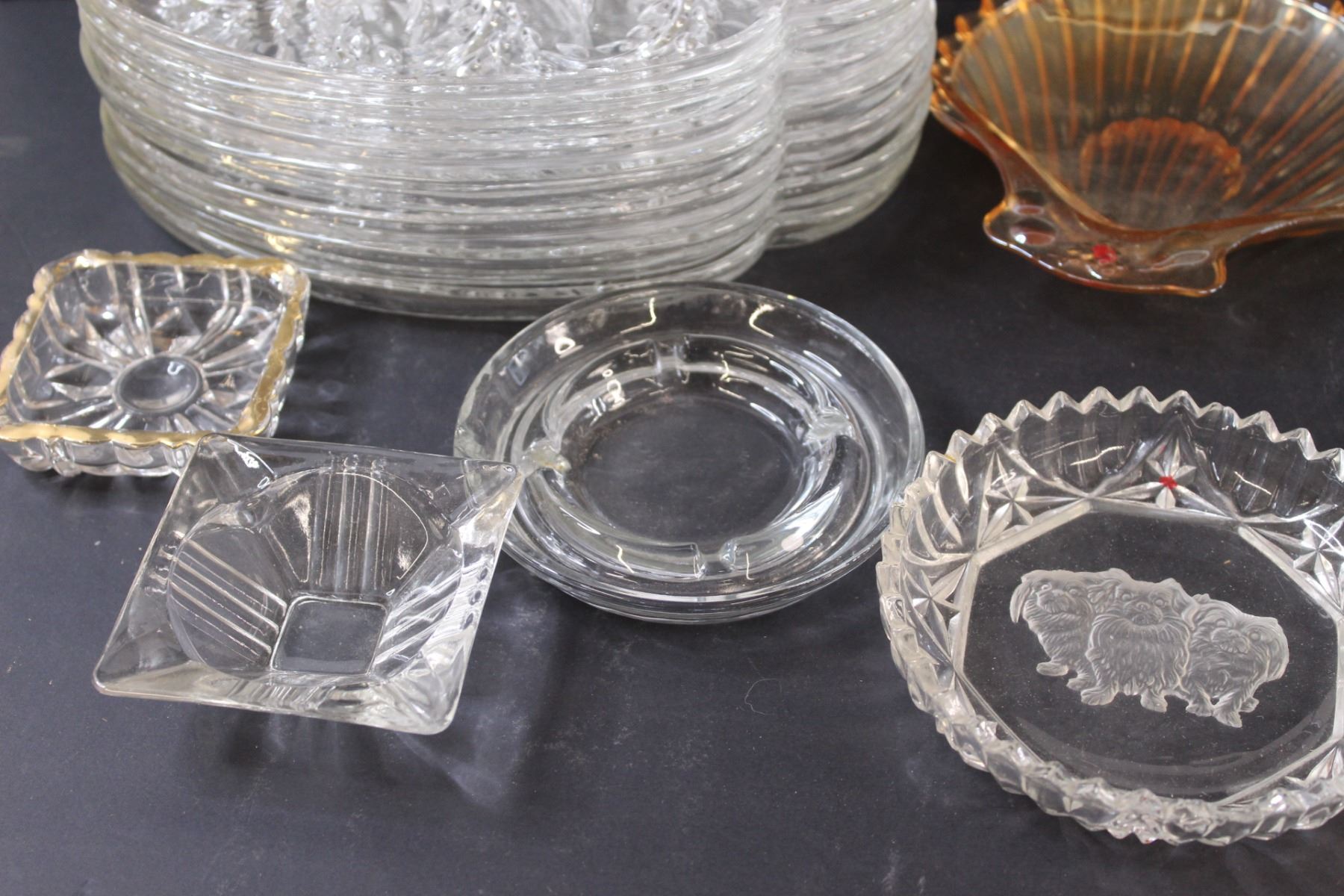 (7) Dainty Tea Set (Plates Only), Art Glass Serving Dish w/Handle & Spoon Set, Ashtrays, Serving Dis