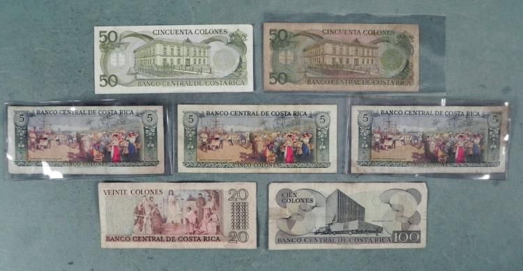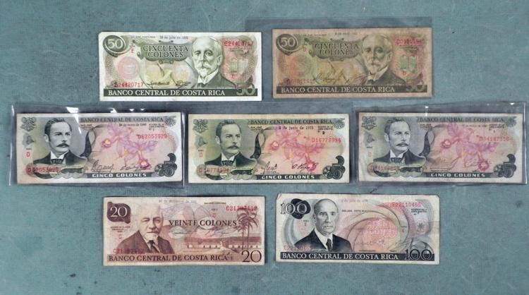 7 Different Costa Rica Paper Currency * Dates: 1975-1990Denominations: (3) 5 Colons, 20 Colons, (2) 50 Colons, 100 Colons