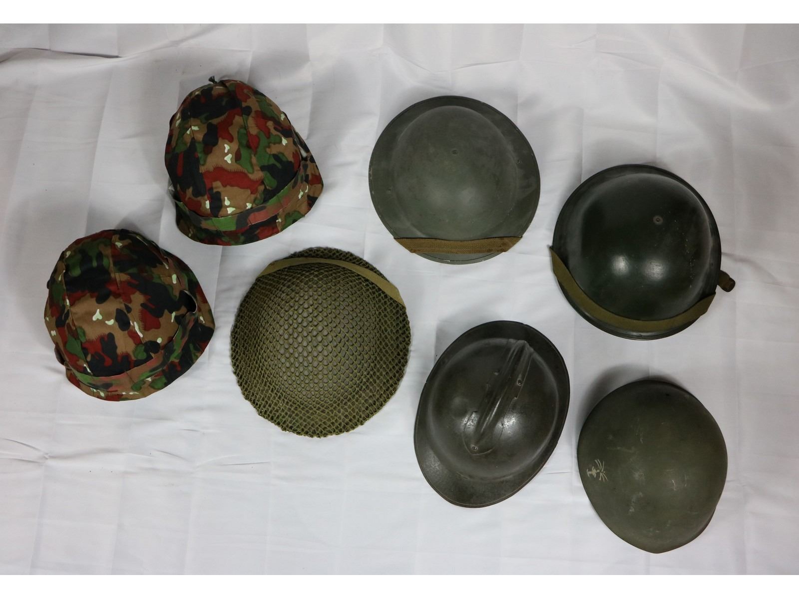 Includes: 1 WWII Italian helmet, no liner. 1 WWII French helmet, no liner. 2 modern Swiss army helmet w/ covers. 2 British Tommy helmets, 1 w/ cargo net cover. 1 British Model 1944 turtle shell helmet w/ liner.
