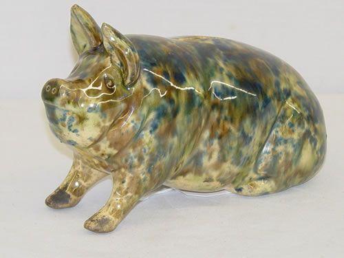 7" FLINT ENAMEL POTTERY PIG FORM BANK - GREAT COLOR, ONE FRONT LEG REPAIRED