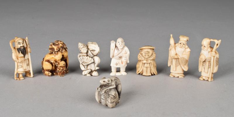 Depicting figures and animals, together with one composition netsuke depicting a lion. Early 20th C.