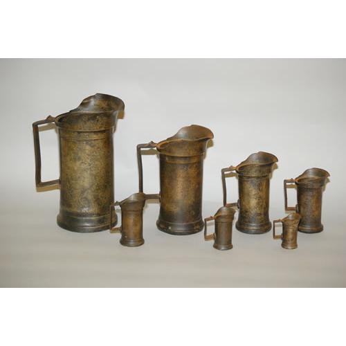 (7) GRADUATED PEWTER MEASURES - SET (7) 19TH CENT. CONTINENTAL HALLMARKED PEWTER PITCHERS W/ HANDLES- FLORAL & SWAN HALLMARKS (PROBABLY DUTCH?) (8" TALL TO 2" TALL) - WEAR, DENTS, OXIDATION, IMPERFECTIONS